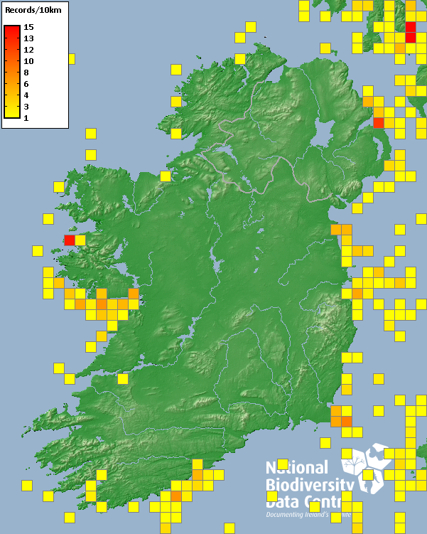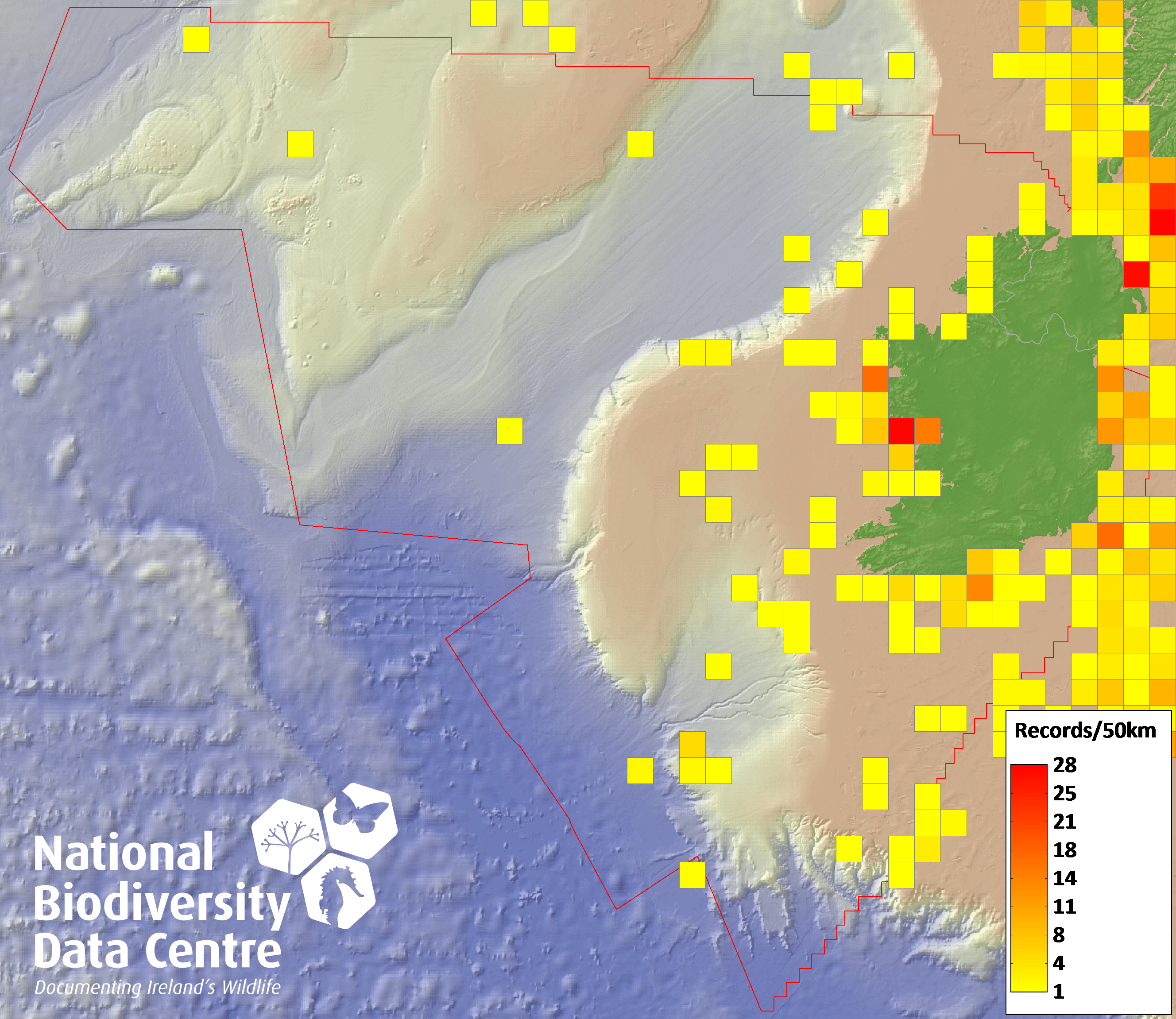 Distribution of the number of records recorded within each 10km grid square (ITM).Marine Map - 50km