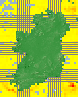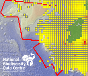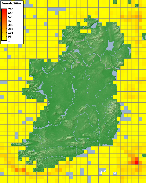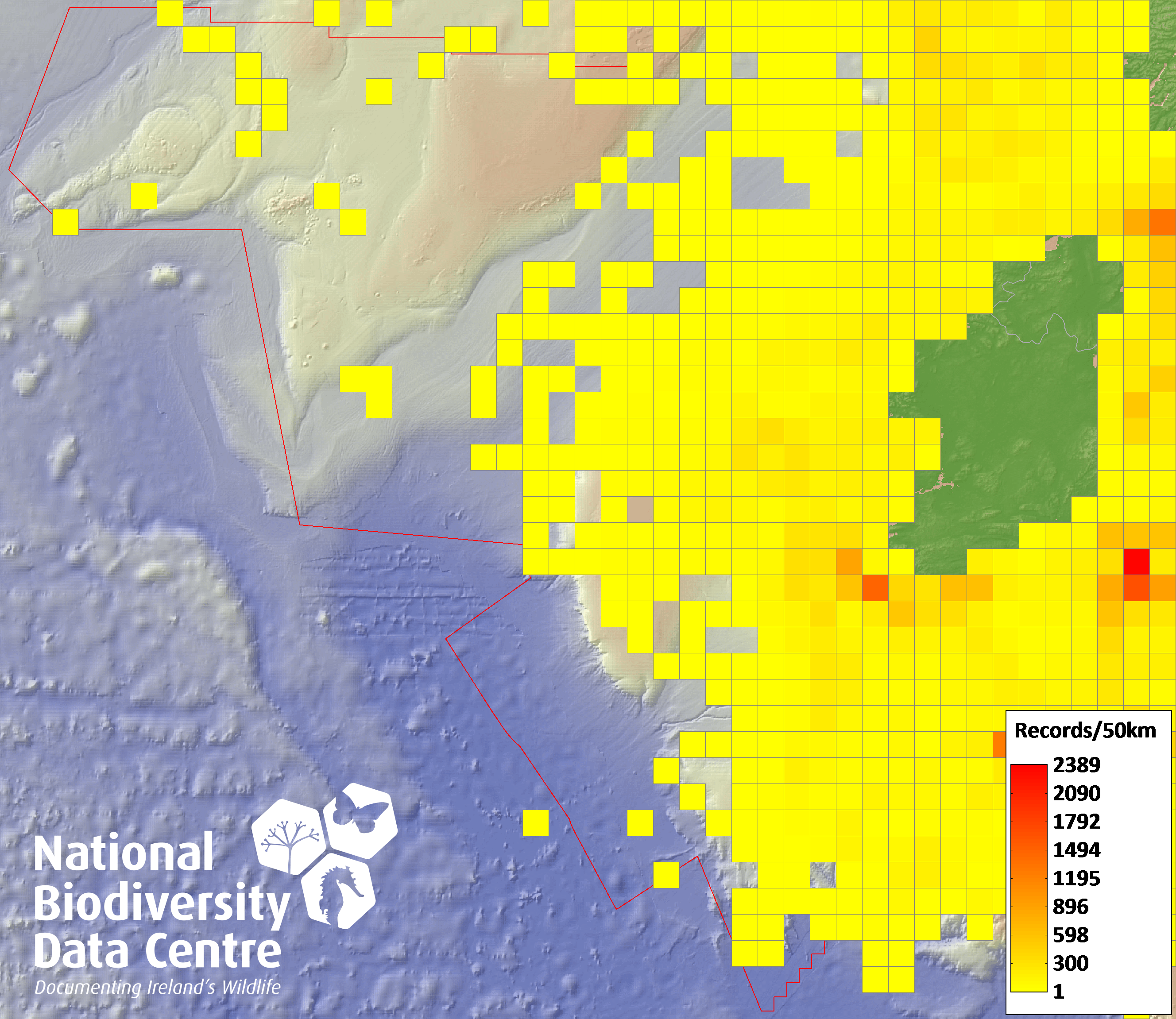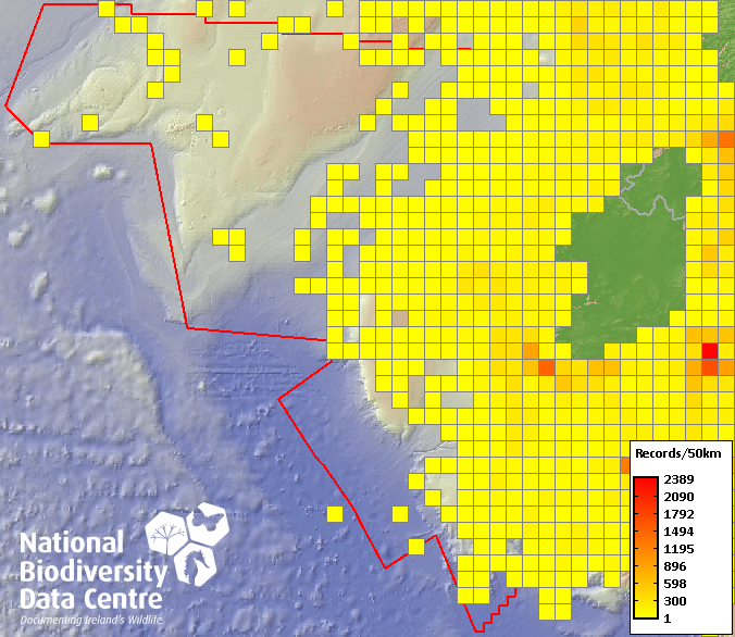 Distribution of the number of records recorded within each 10km grid square (ITM).Marine Map - 50km
