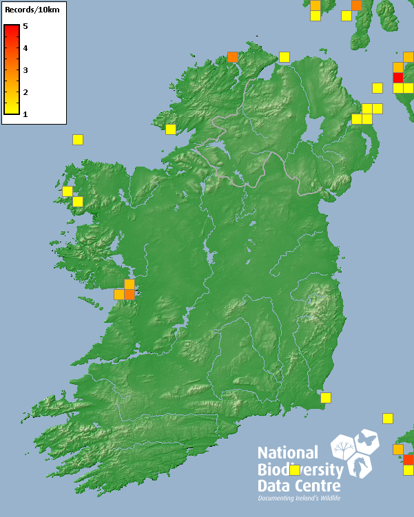 Distribution of the number of records recorded within each 10km grid square (ITM).Marine Map - 50km