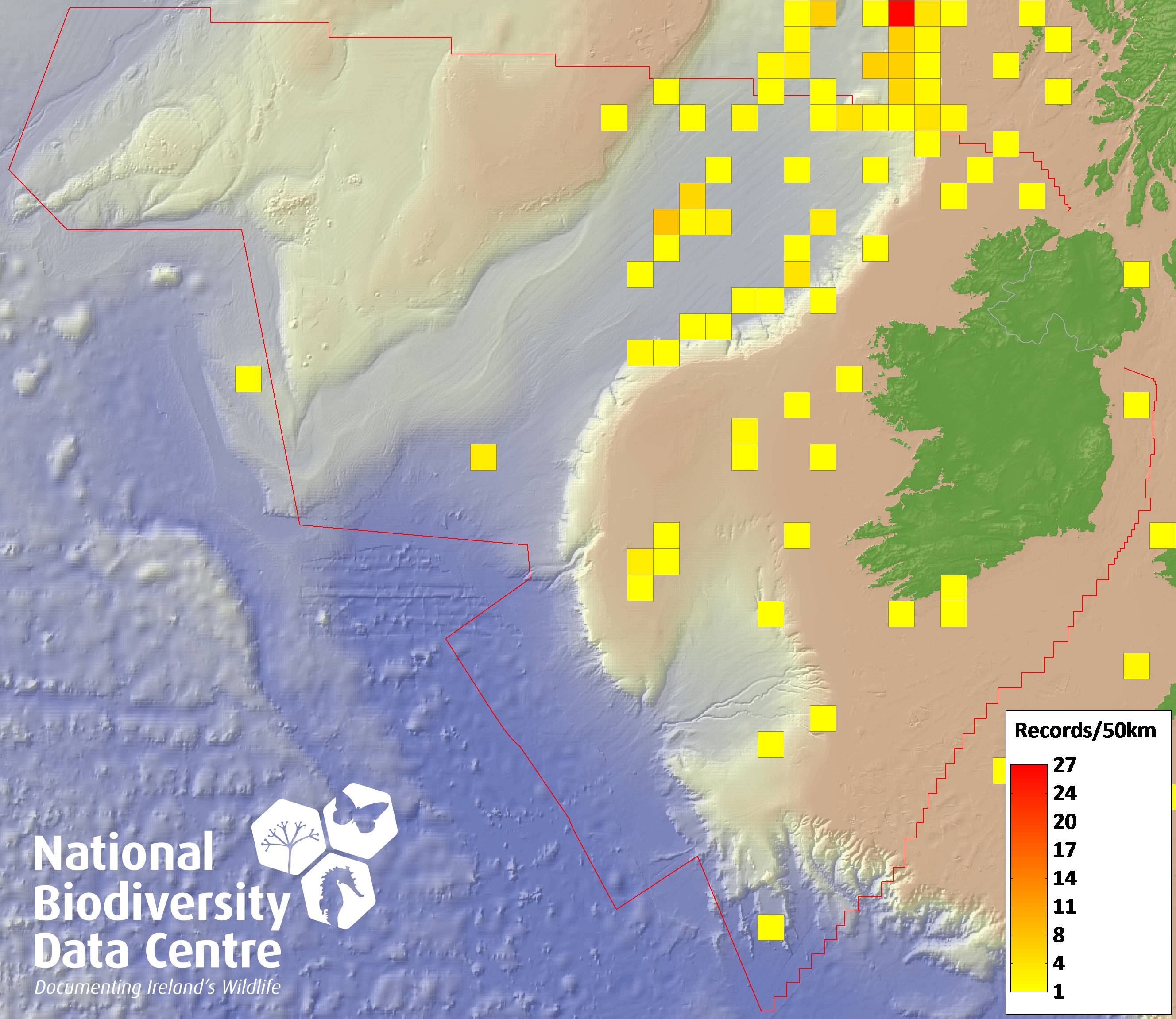 Distribution of the number of records recorded within each 10km grid square (ITM).Marine Map - 50km