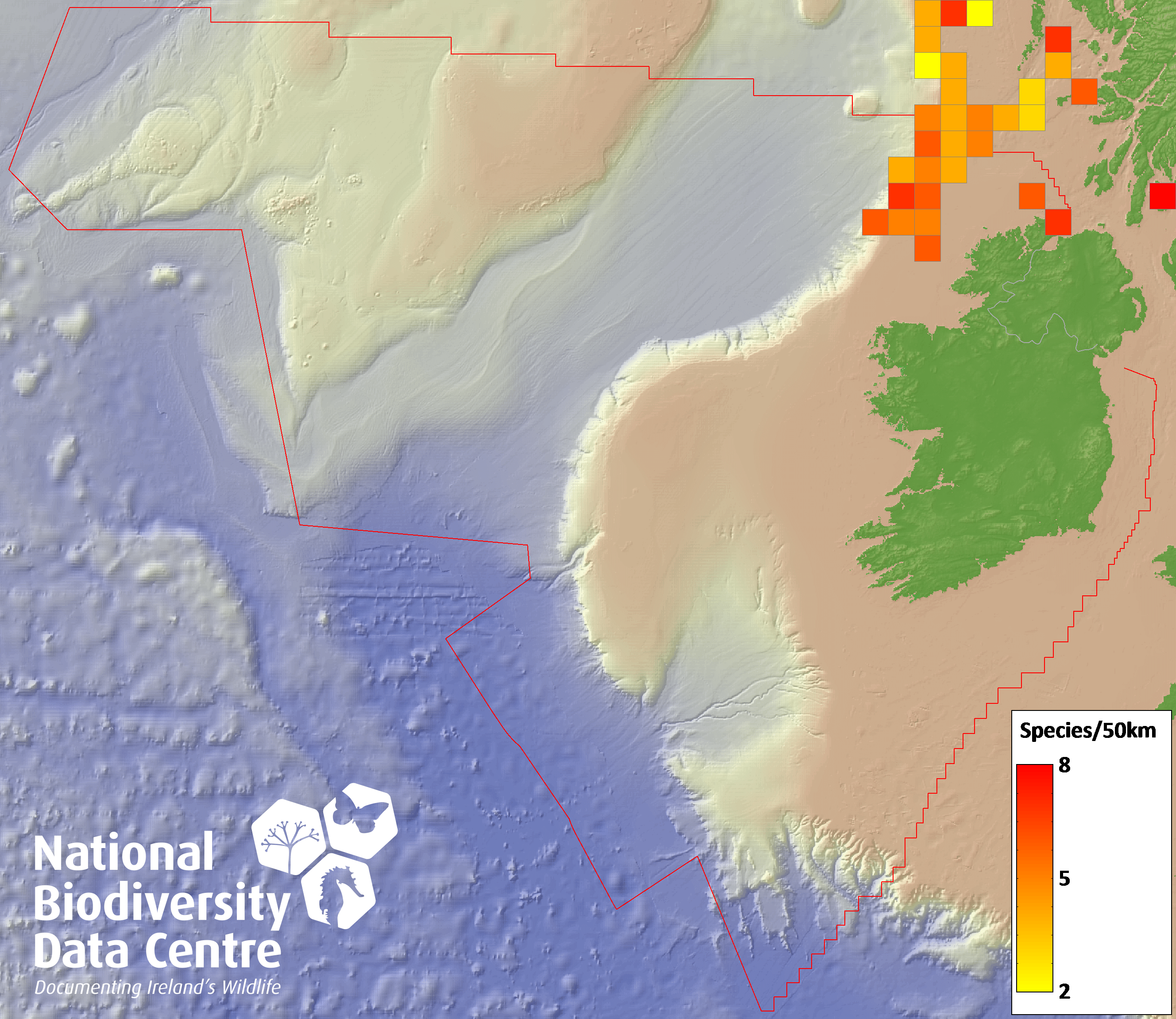 Distribution of the number of records within each 10km grid square (ITM).Marine Map - 50Km