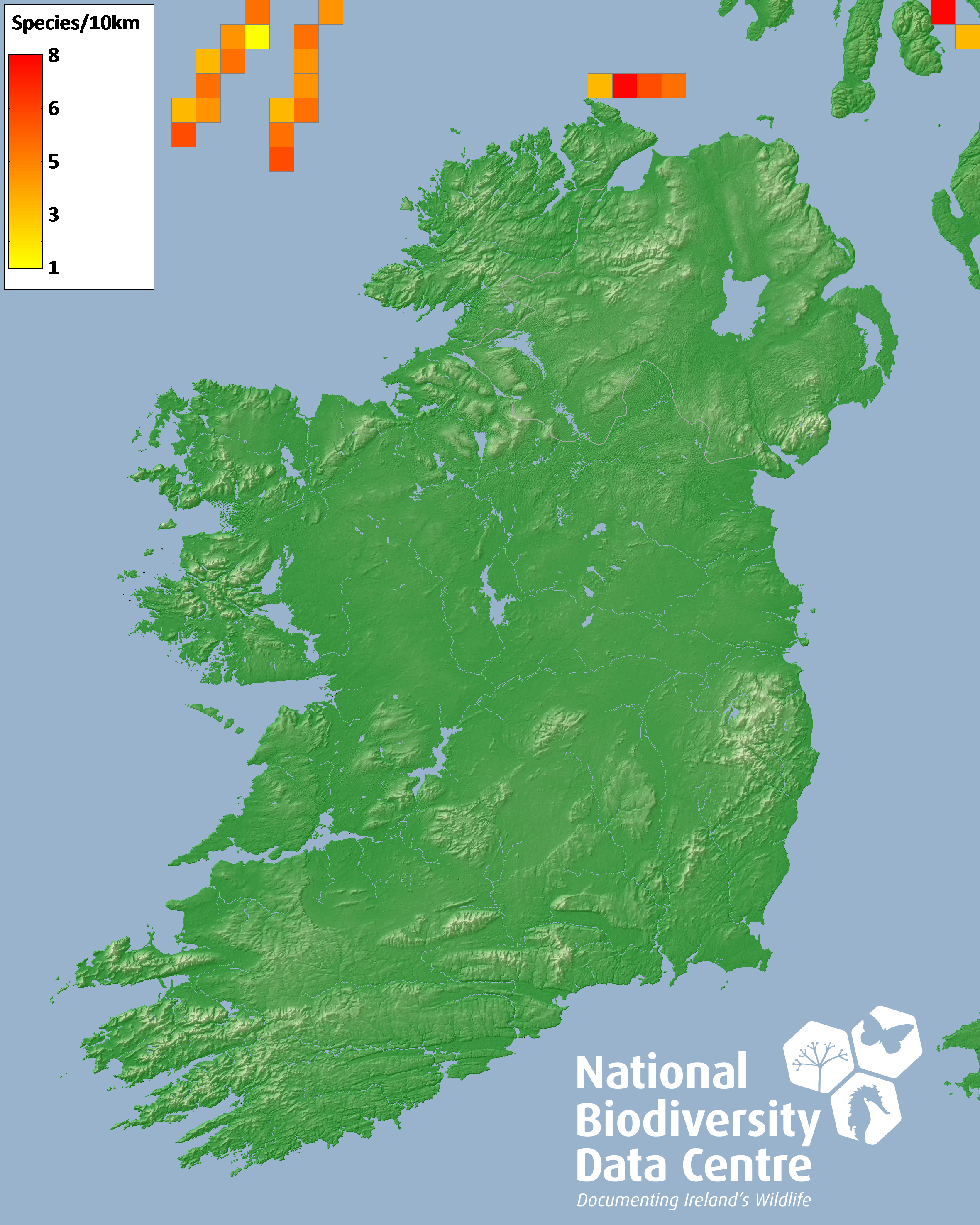 Distribution of the number of species recorded within each 10km grid square (ITM).Marine Map - 50Km