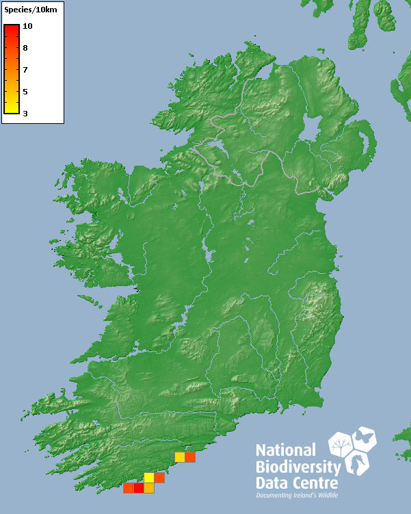 Distribution of the number of species recorded within each 10km grid square (ITM).Marine Map - 50Km