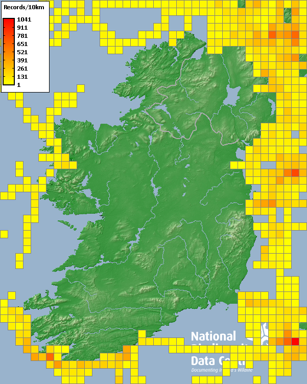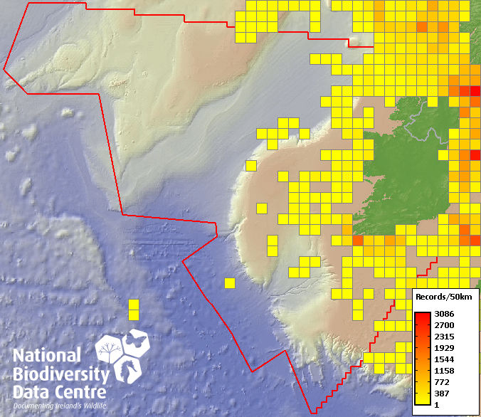 Distribution of the number of records within each 10km grid square (ITM).Marine Map - 50Km