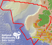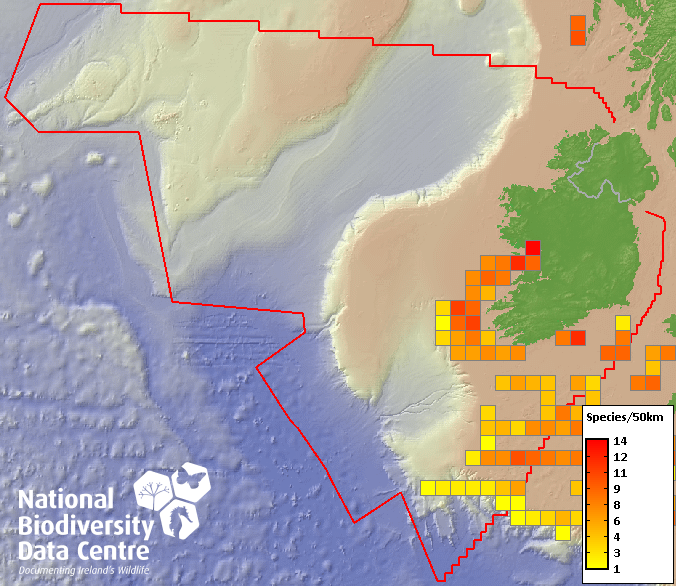 Distribution of the number of records within each 10km grid square (ITM).Marine Map - 50Km