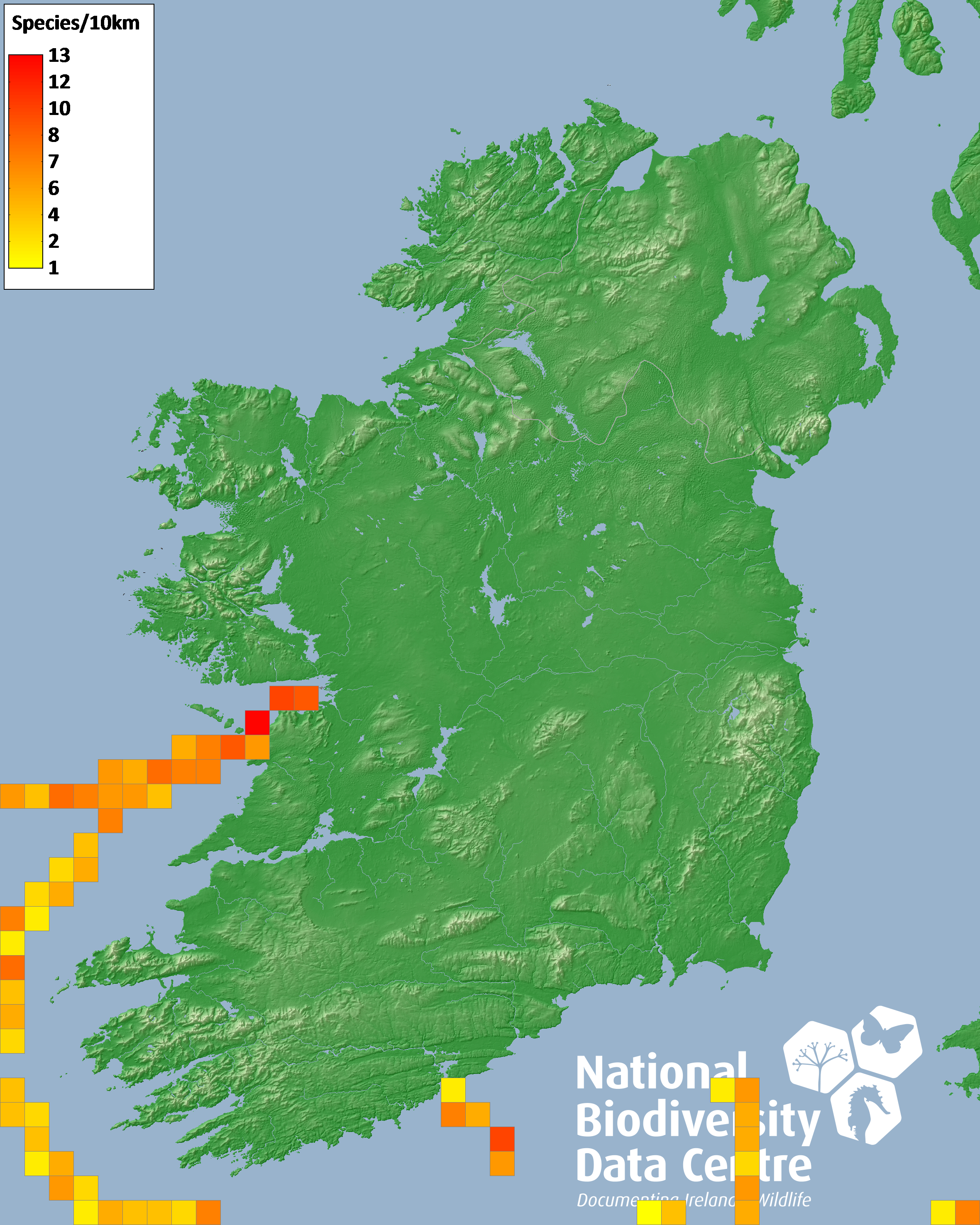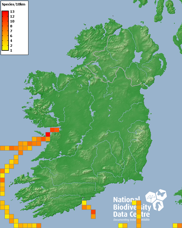 Distribution of the number of species recorded within each 10km grid square (ITM).Marine Map - 50Km