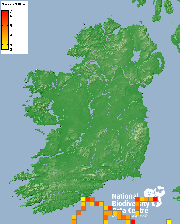 Distribution of the number of species recorded within each 10km grid square (ITM).Marine Map - 50Km
