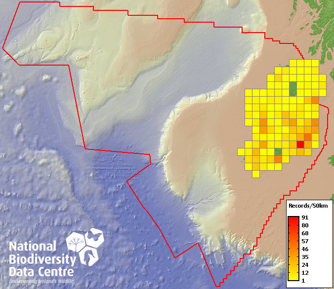 Distribution of the number of records recorded within each 10km grid square (ITM).Marine Map - 50km