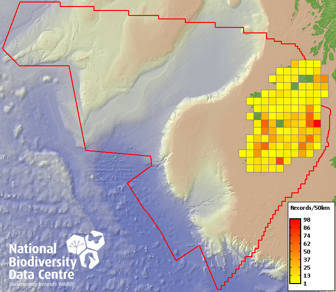 Distribution of the number of records recorded within each 10km grid square (ITM).Marine Map - 50km