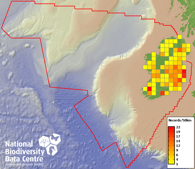 Distribution of the number of records recorded within each 10km grid square (ITM).Marine Map - 50km