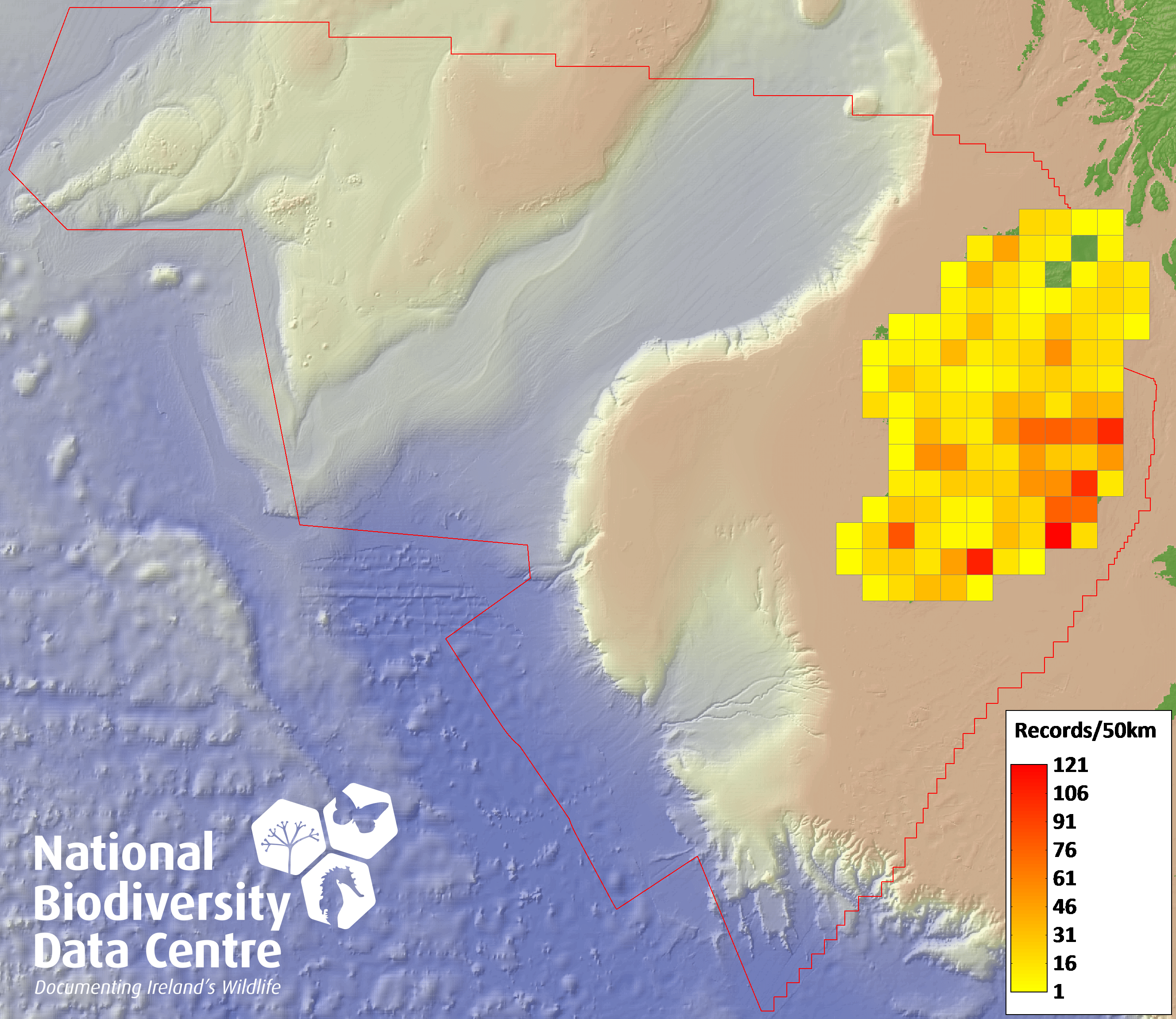 Distribution of the number of records recorded within each 10km grid square (ITM).Marine Map - 50km