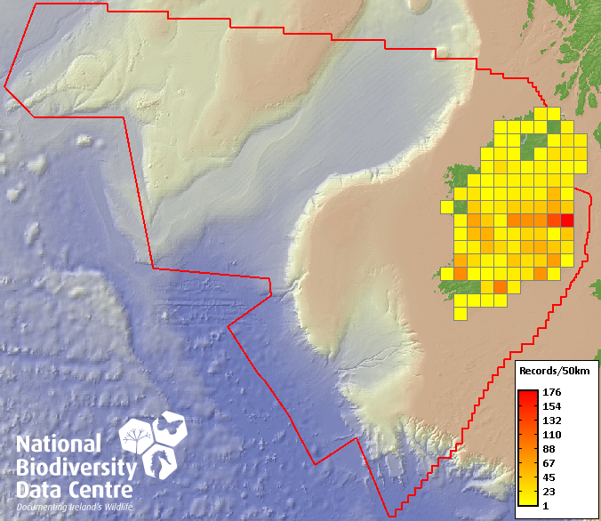Distribution of the number of records recorded within each 10km grid square (ITM).Marine Map - 50km