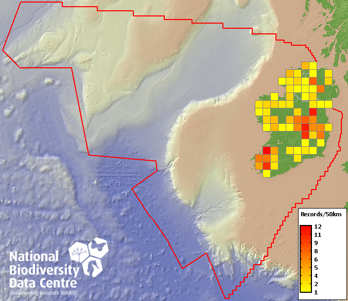Distribution of the number of records recorded within each 10km grid square (ITM).Marine Map - 50km