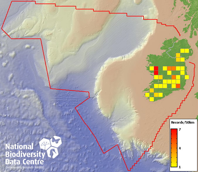 Distribution of the number of records recorded within each 10km grid square (ITM).Marine Map - 50km