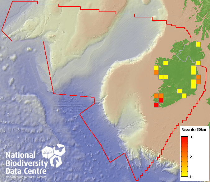 Distribution of the number of records recorded within each 10km grid square (ITM).Marine Map - 50km