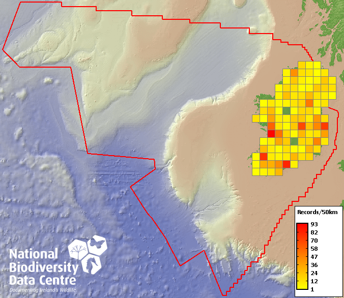 Distribution of the number of records recorded within each 10km grid square (ITM).Marine Map - 50km