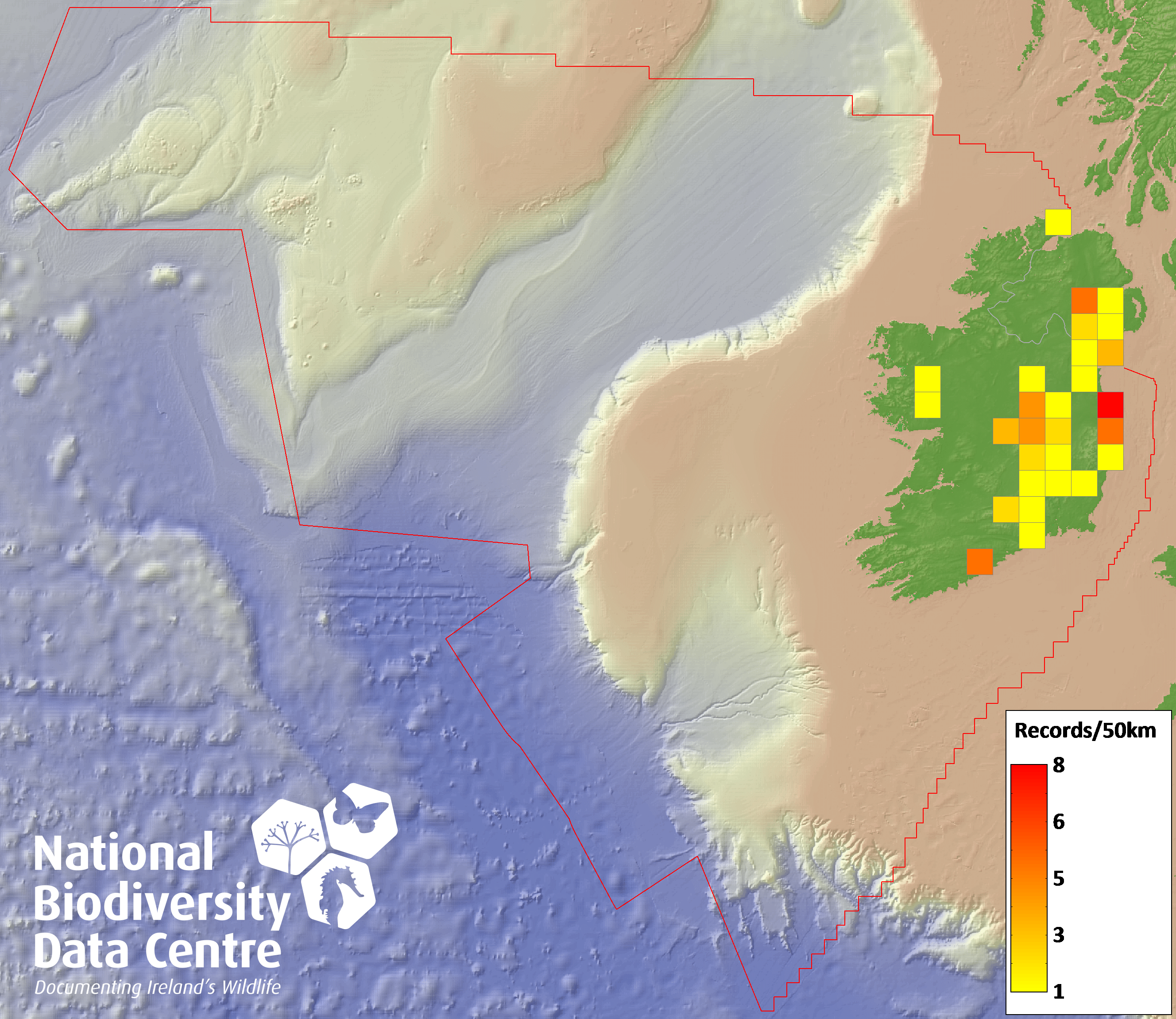 Distribution of the number of records recorded within each 10km grid square (ITM).Marine Map - 50km