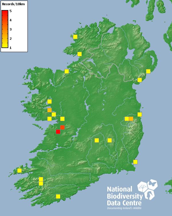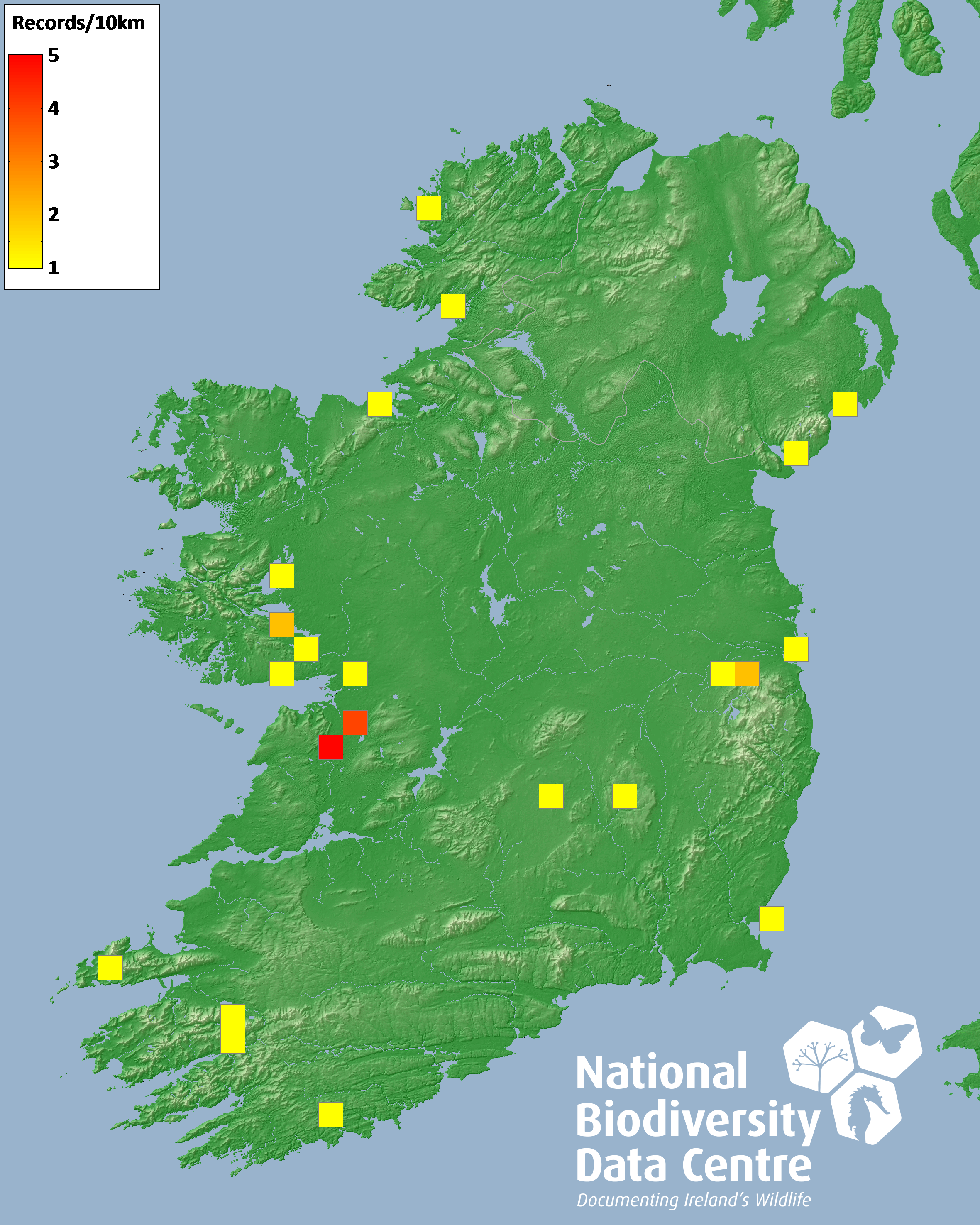 Distribution of the number of records recorded within each 10km grid square (ITM).Marine Map - 50km