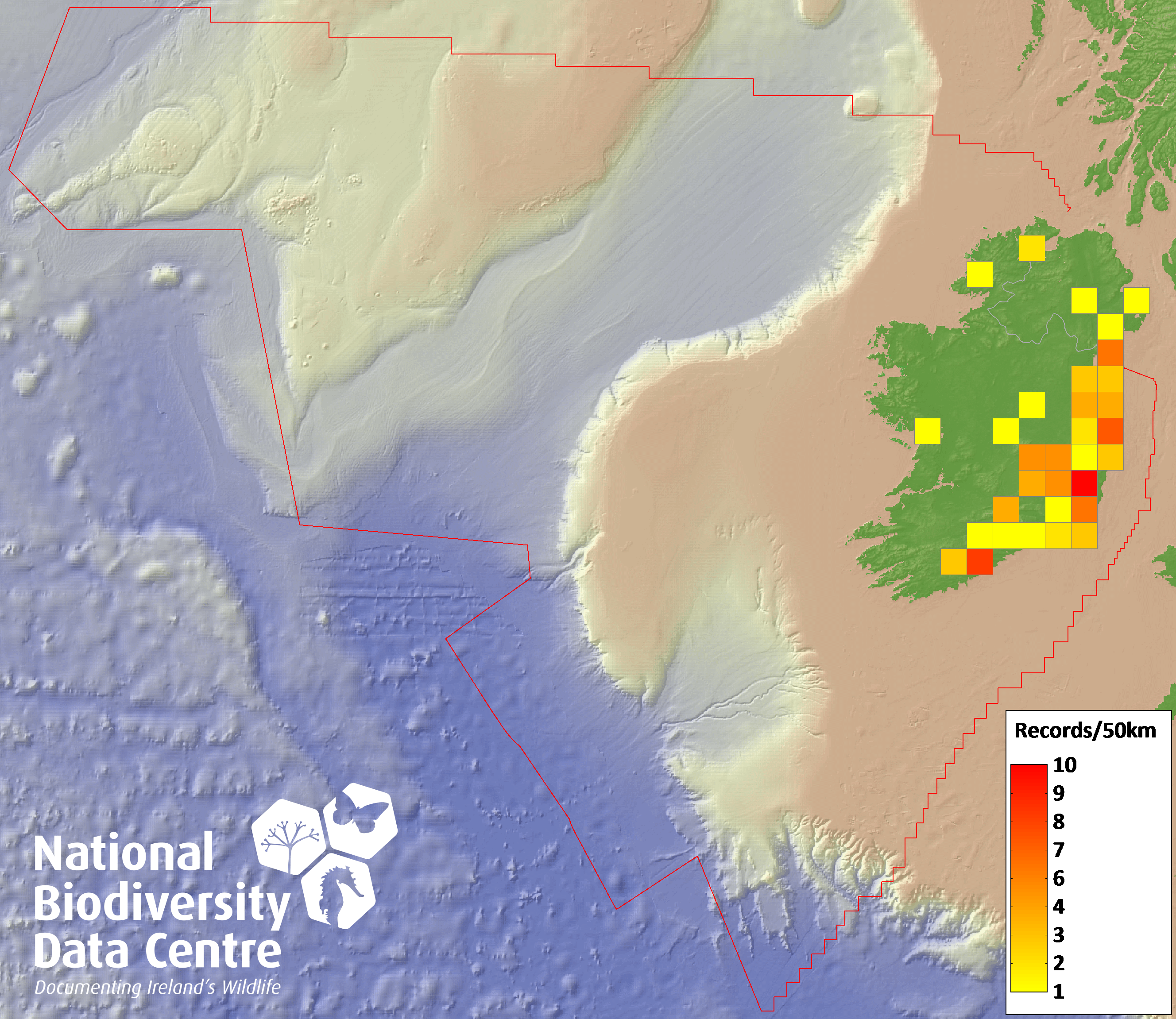 Distribution of the number of records recorded within each 10km grid square (ITM).Marine Map - 50km
