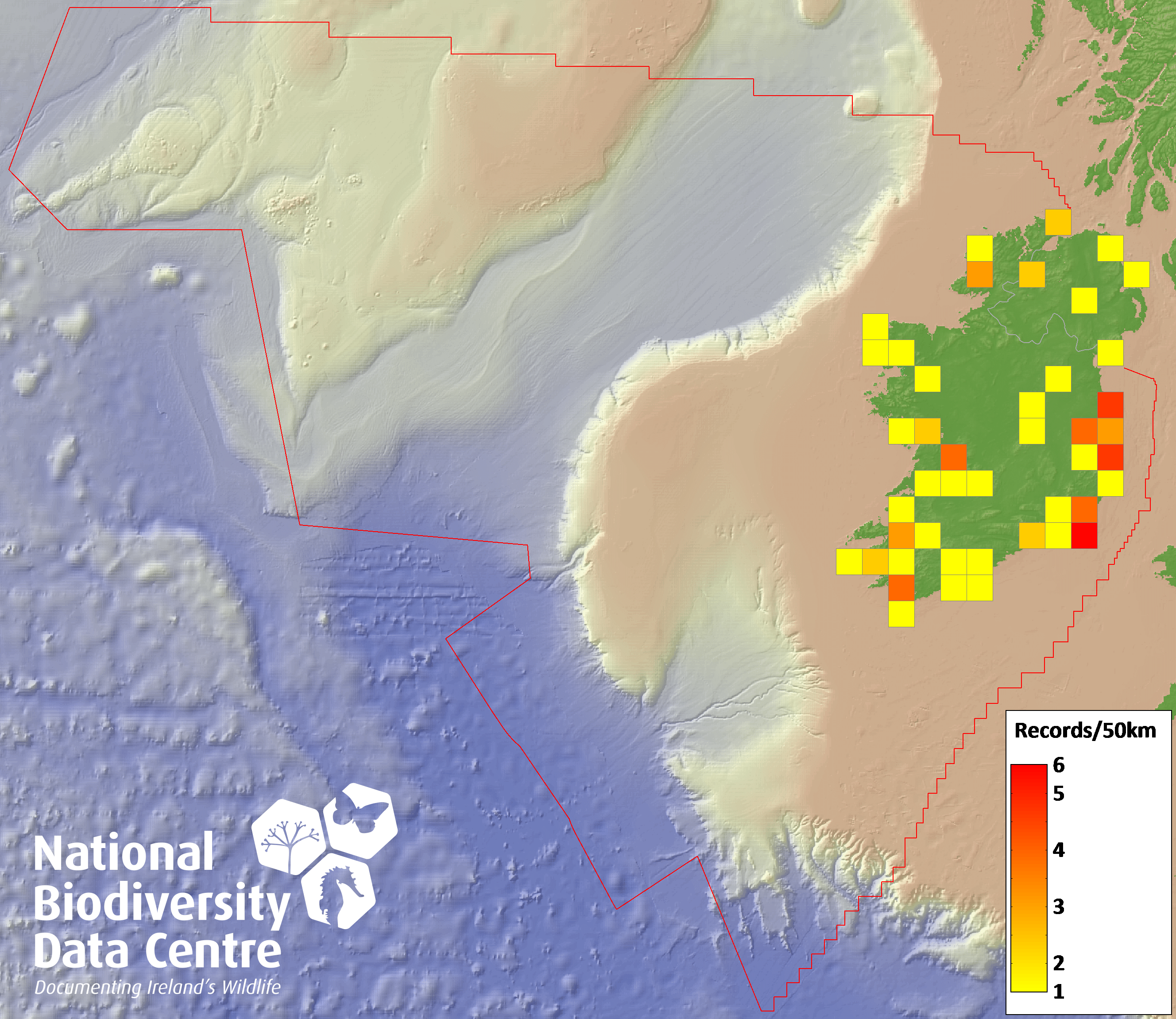 Distribution of the number of records recorded within each 10km grid square (ITM).Marine Map - 50km