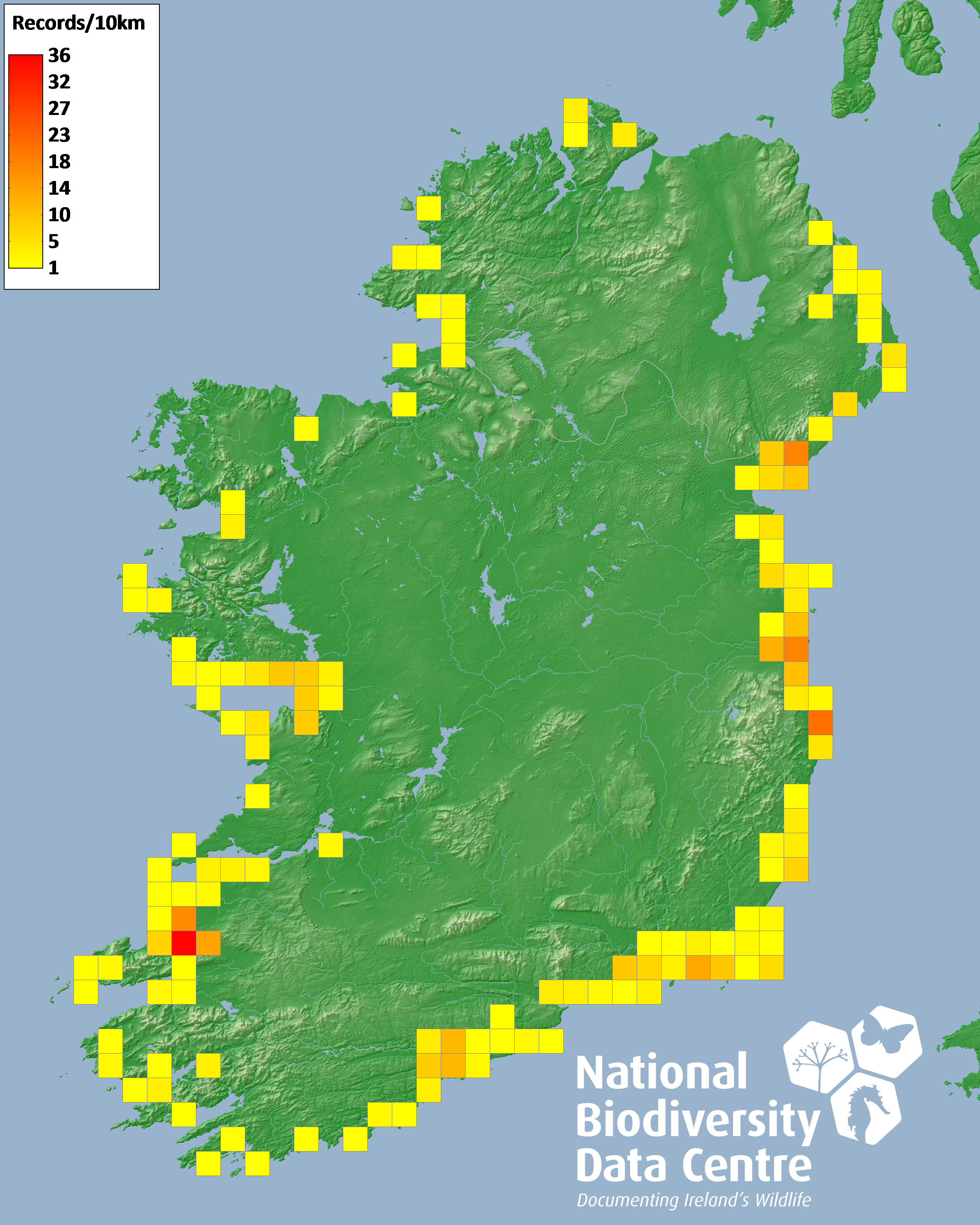 Distribution of the number of records recorded within each 10km grid square (ITM).Marine Map - 50km