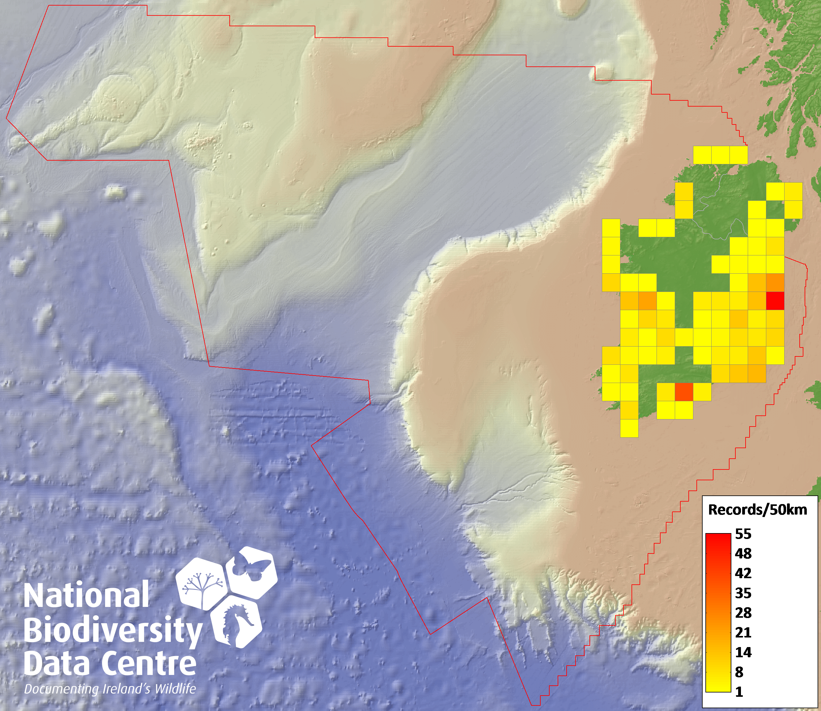Distribution of the number of records recorded within each 10km grid square (ITM).Marine Map - 50km