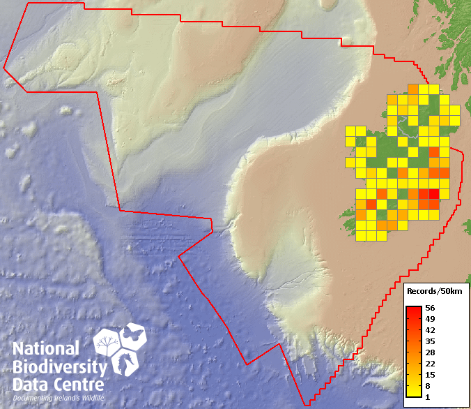Distribution of the number of records recorded within each 10km grid square (ITM).Marine Map - 50km