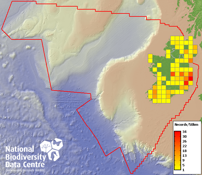Distribution of the number of records recorded within each 10km grid square (ITM).Marine Map - 50km