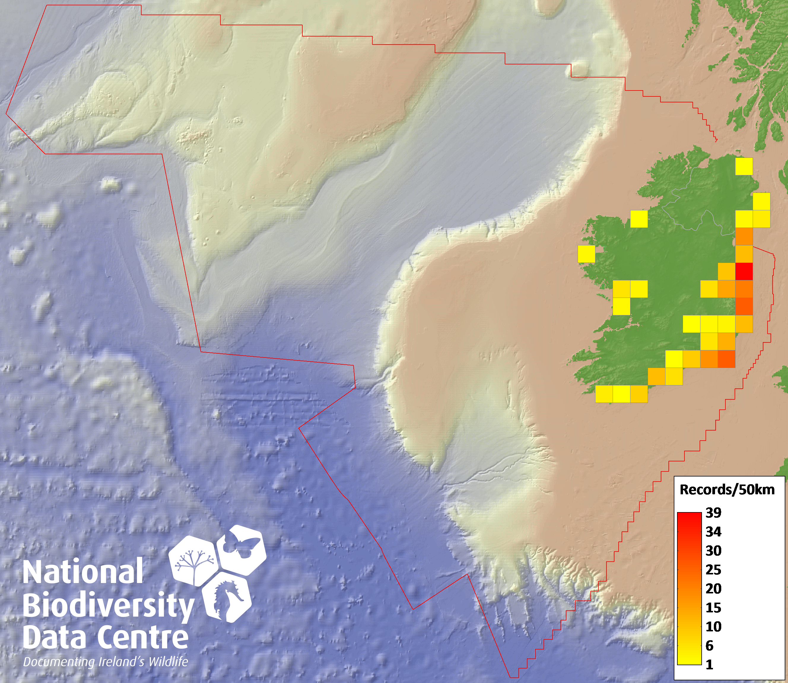 Distribution of the number of records recorded within each 10km grid square (ITM).Marine Map - 50km