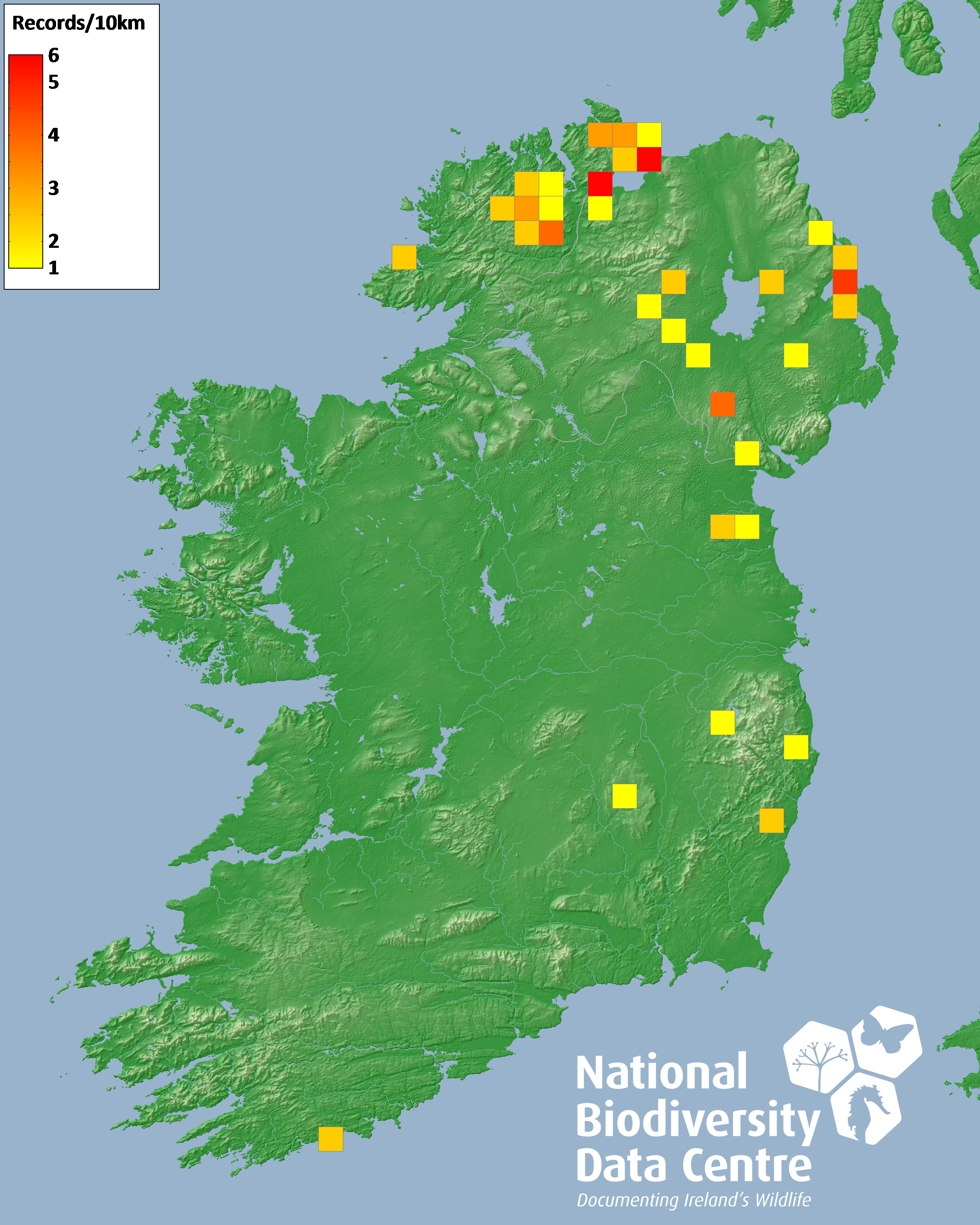 Distribution of the number of records recorded within each 10km grid square (ITM).Marine Map - 50km