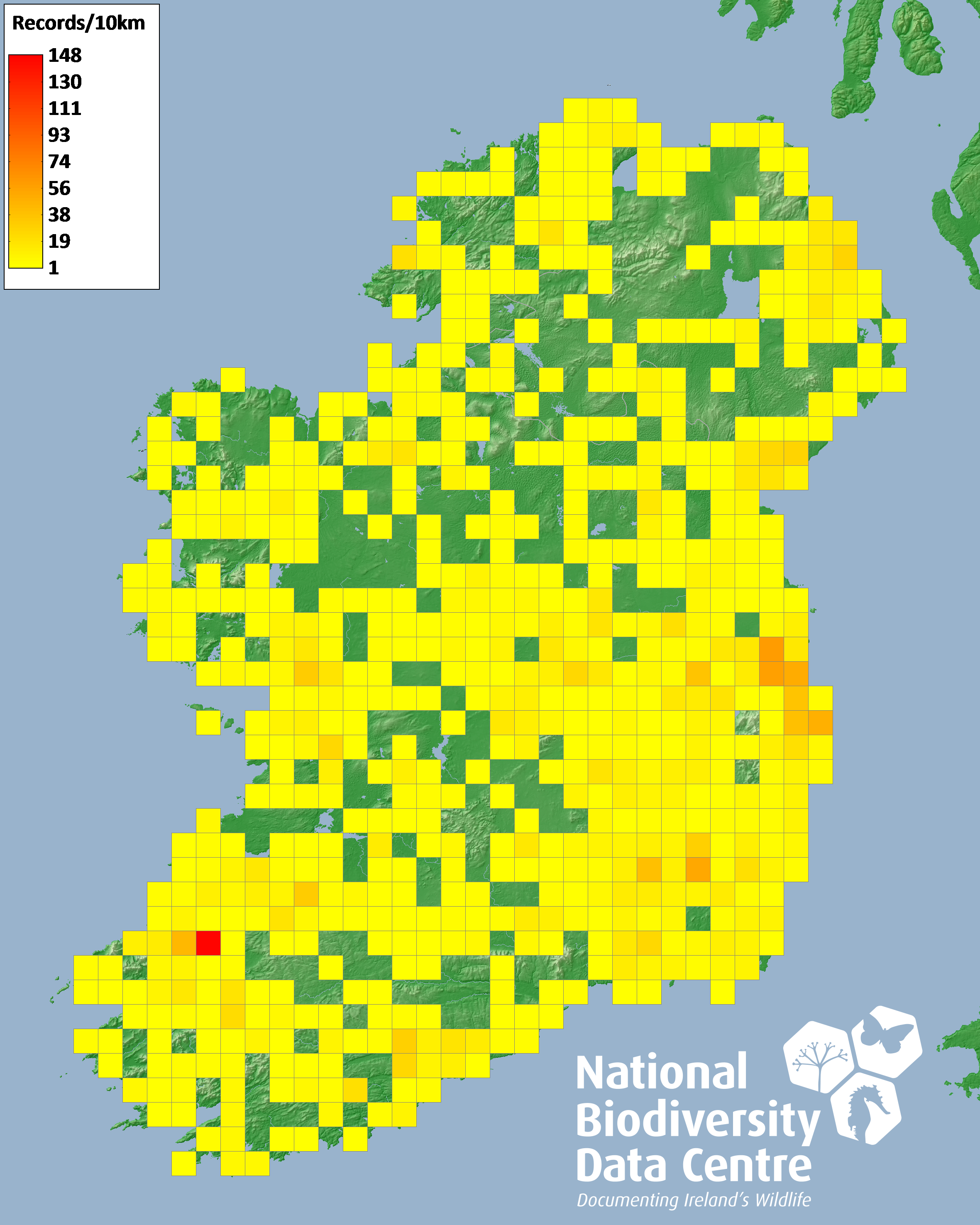 Distribution of the number of records recorded within each 10km grid square (ITM).Marine Map - 50km