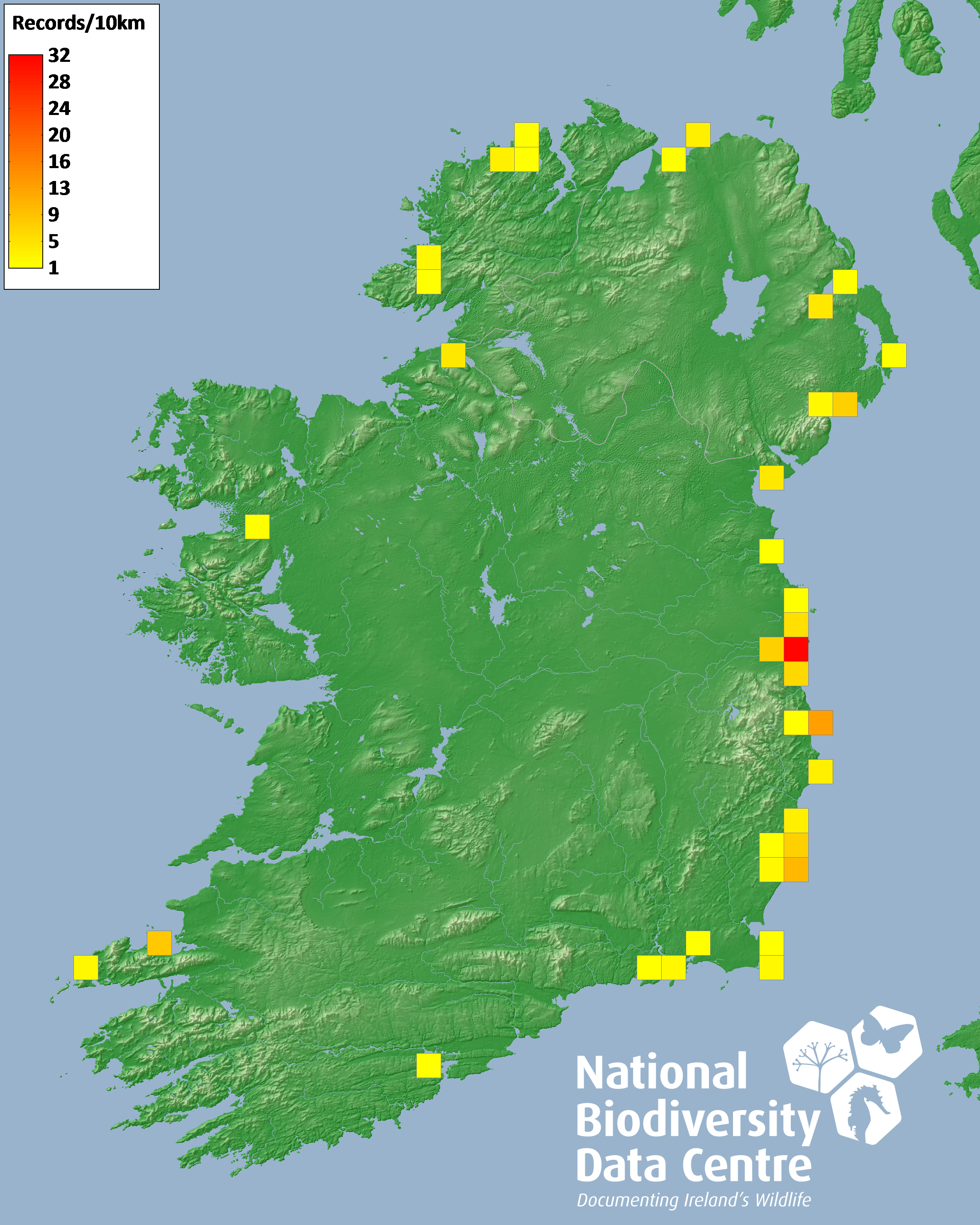Distribution of the number of records recorded within each 10km grid square (ITM).Marine Map - 50km