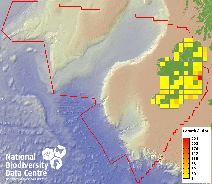 Distribution of the number of records recorded within each 10km grid square (ITM).Marine Map - 50km