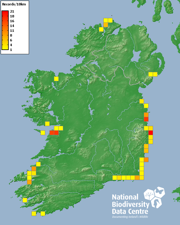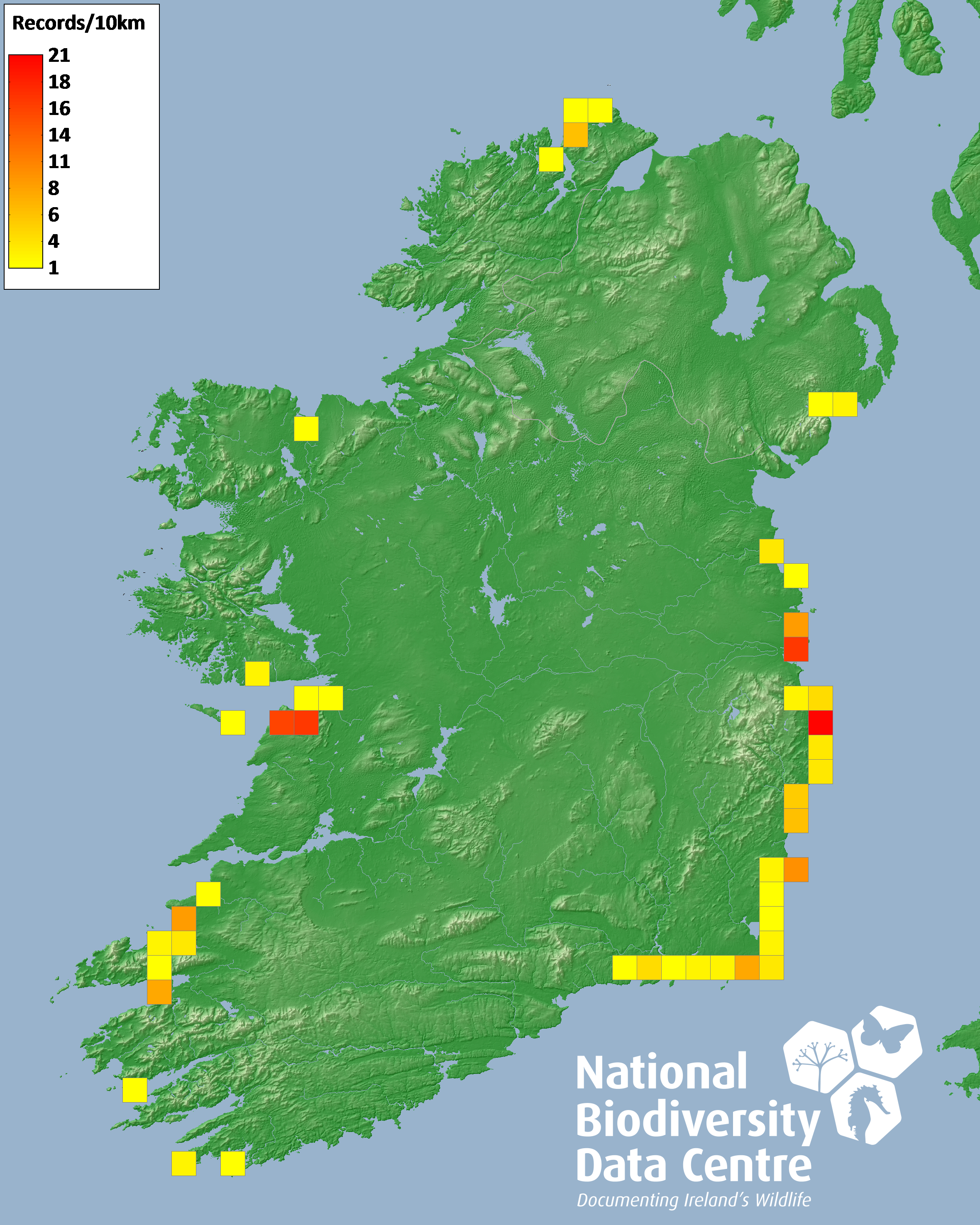 Distribution of the number of records recorded within each 10km grid square (ITM).Marine Map - 50km
