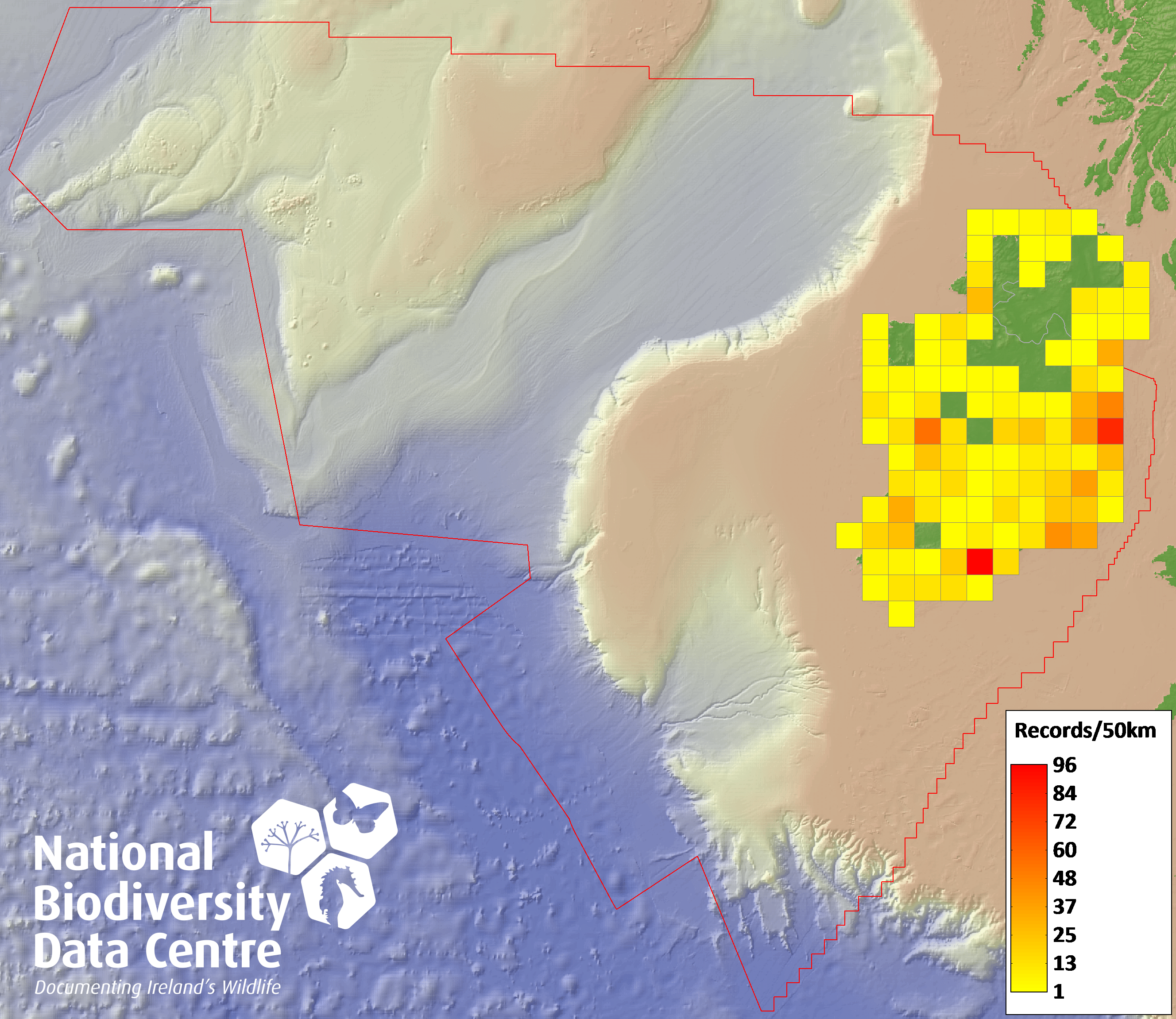 Distribution of the number of records recorded within each 10km grid square (ITM).Marine Map - 50km