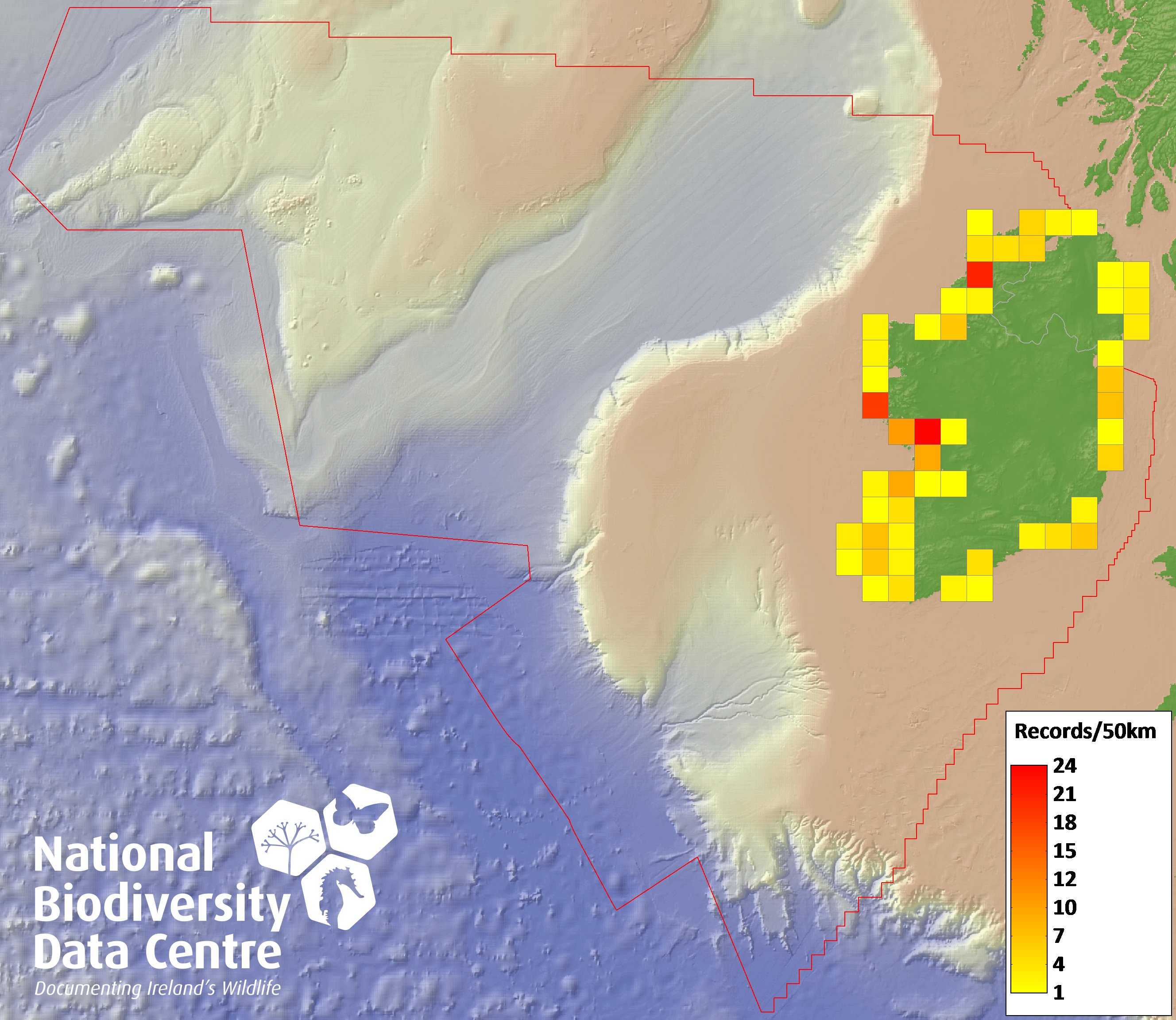 Distribution of the number of records recorded within each 10km grid square (ITM).Marine Map - 50km