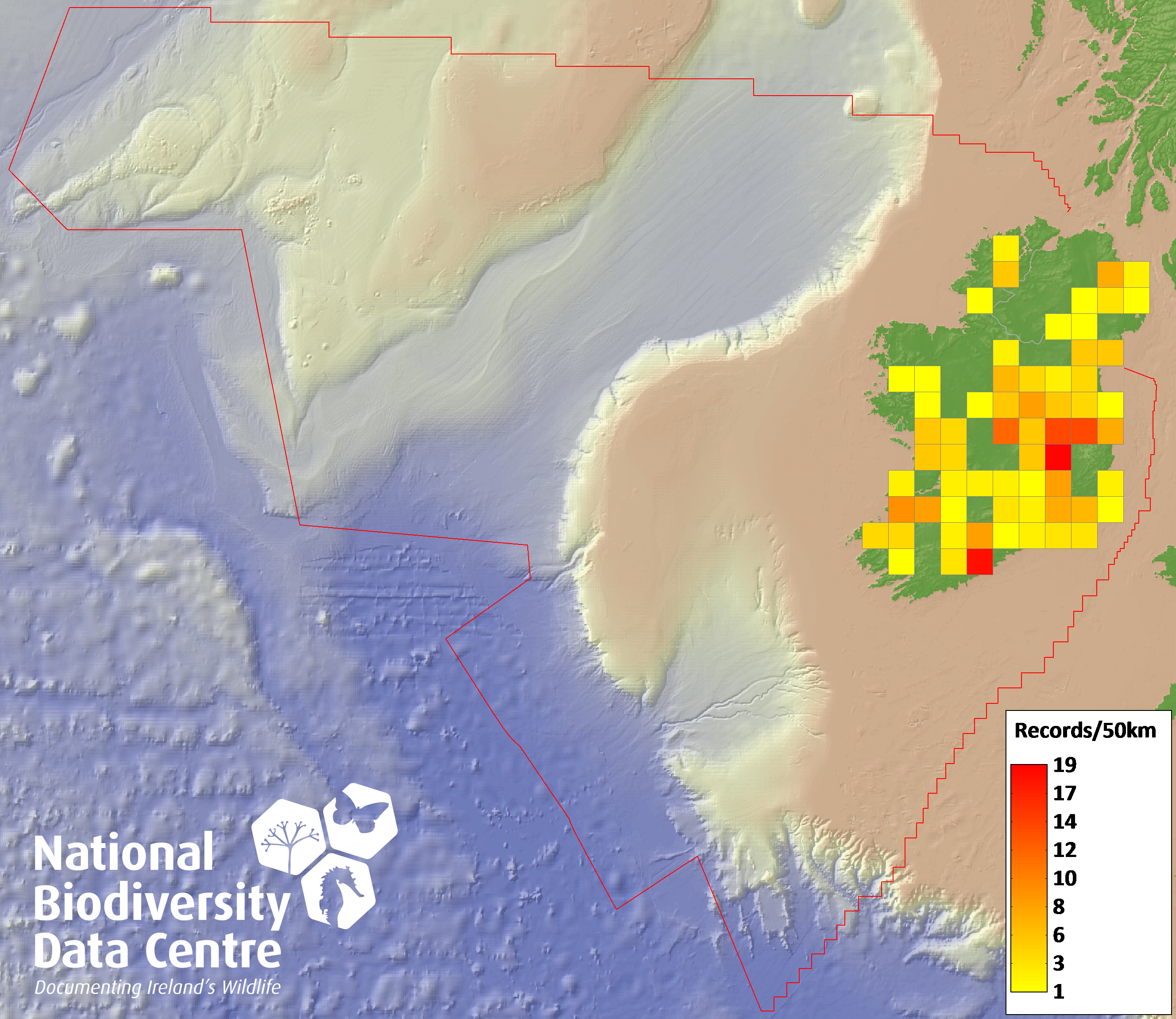 Distribution of the number of records recorded within each 10km grid square (ITM).Marine Map - 50km