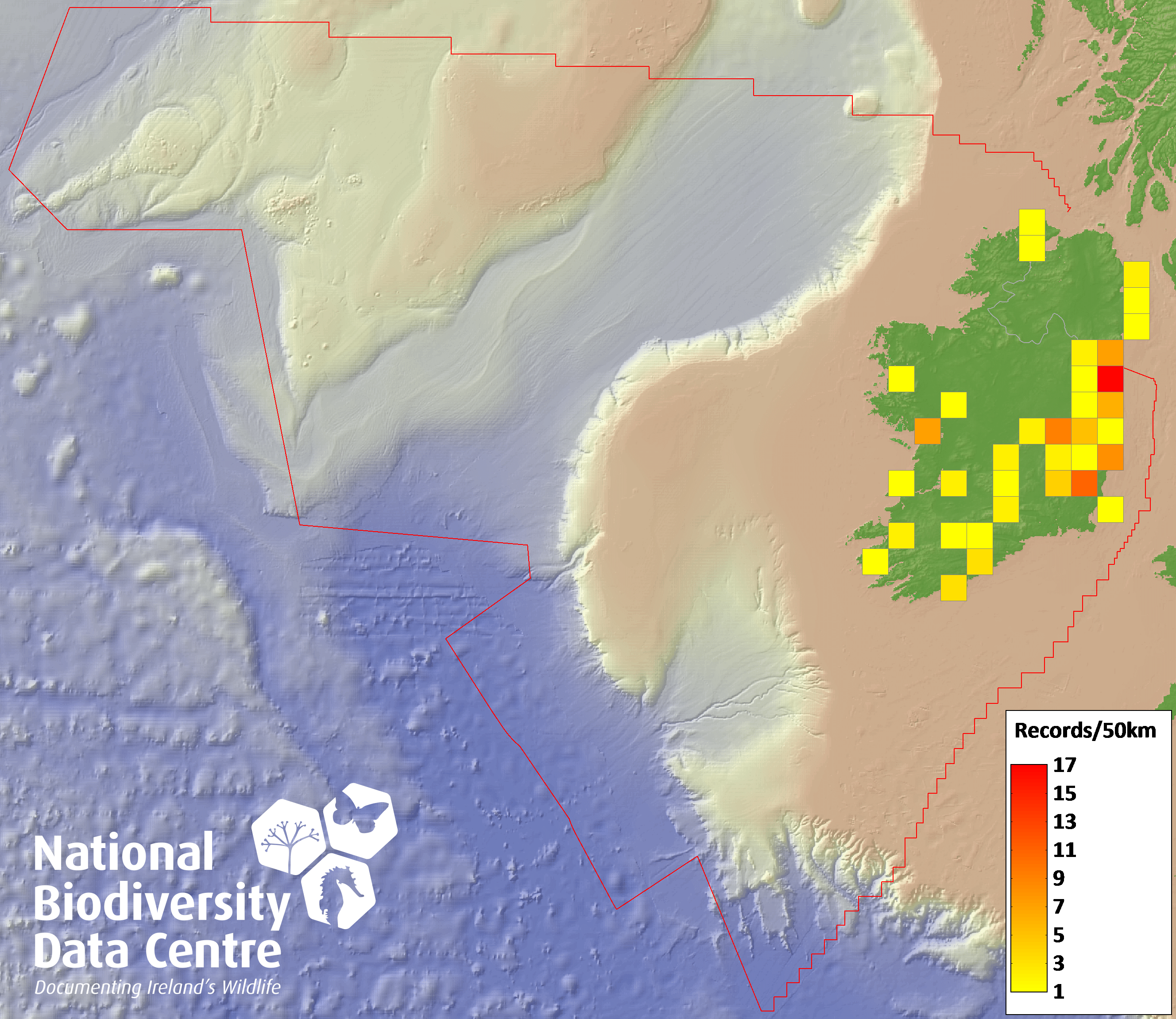 Distribution of the number of records recorded within each 10km grid square (ITM).Marine Map - 50km