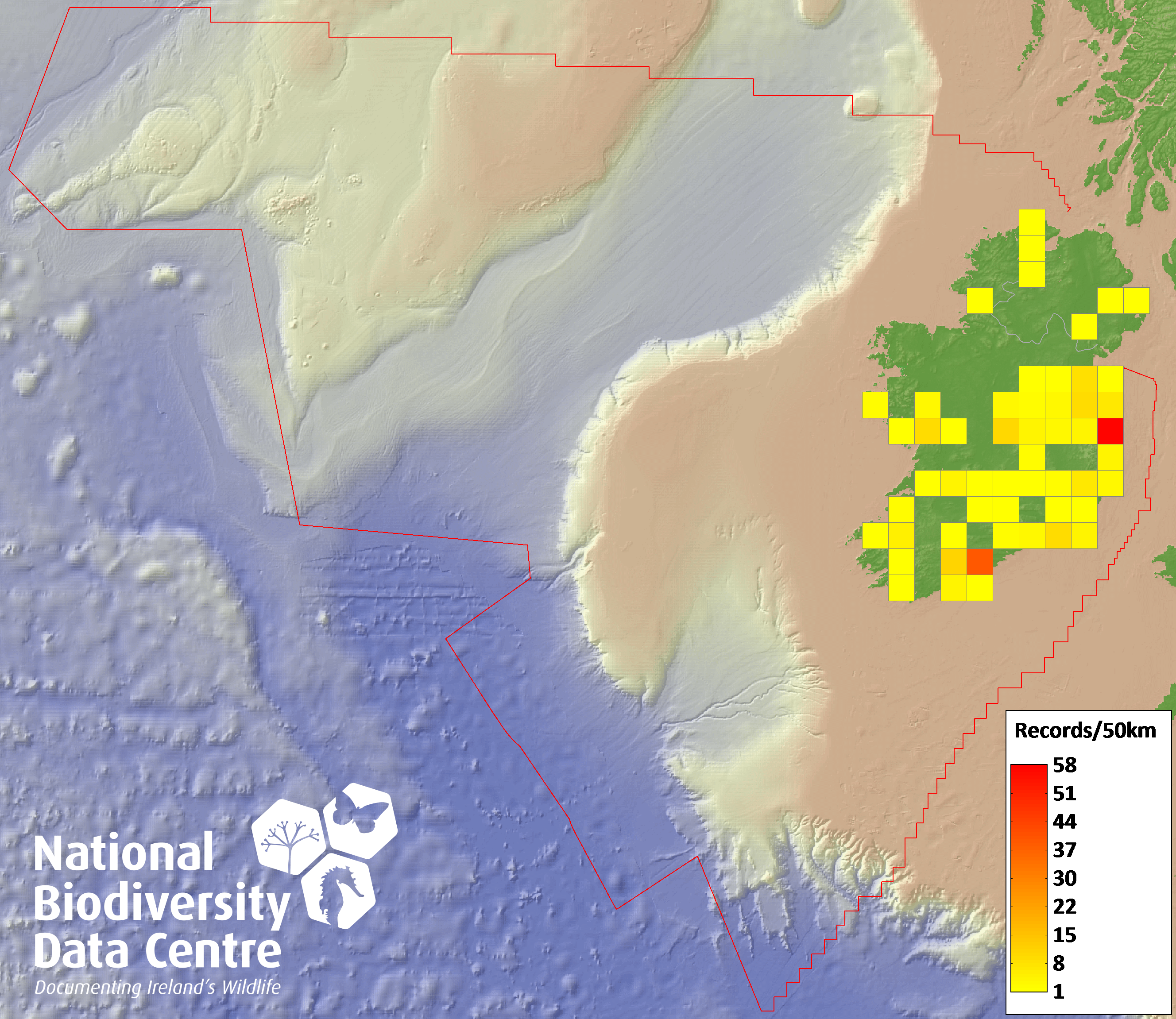 Distribution of the number of records recorded within each 10km grid square (ITM).Marine Map - 50km