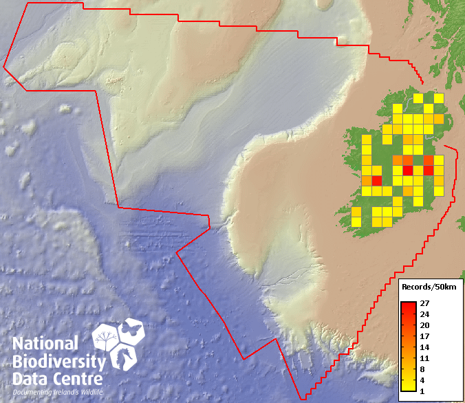 Distribution of the number of records recorded within each 10km grid square (ITM).Marine Map - 50km