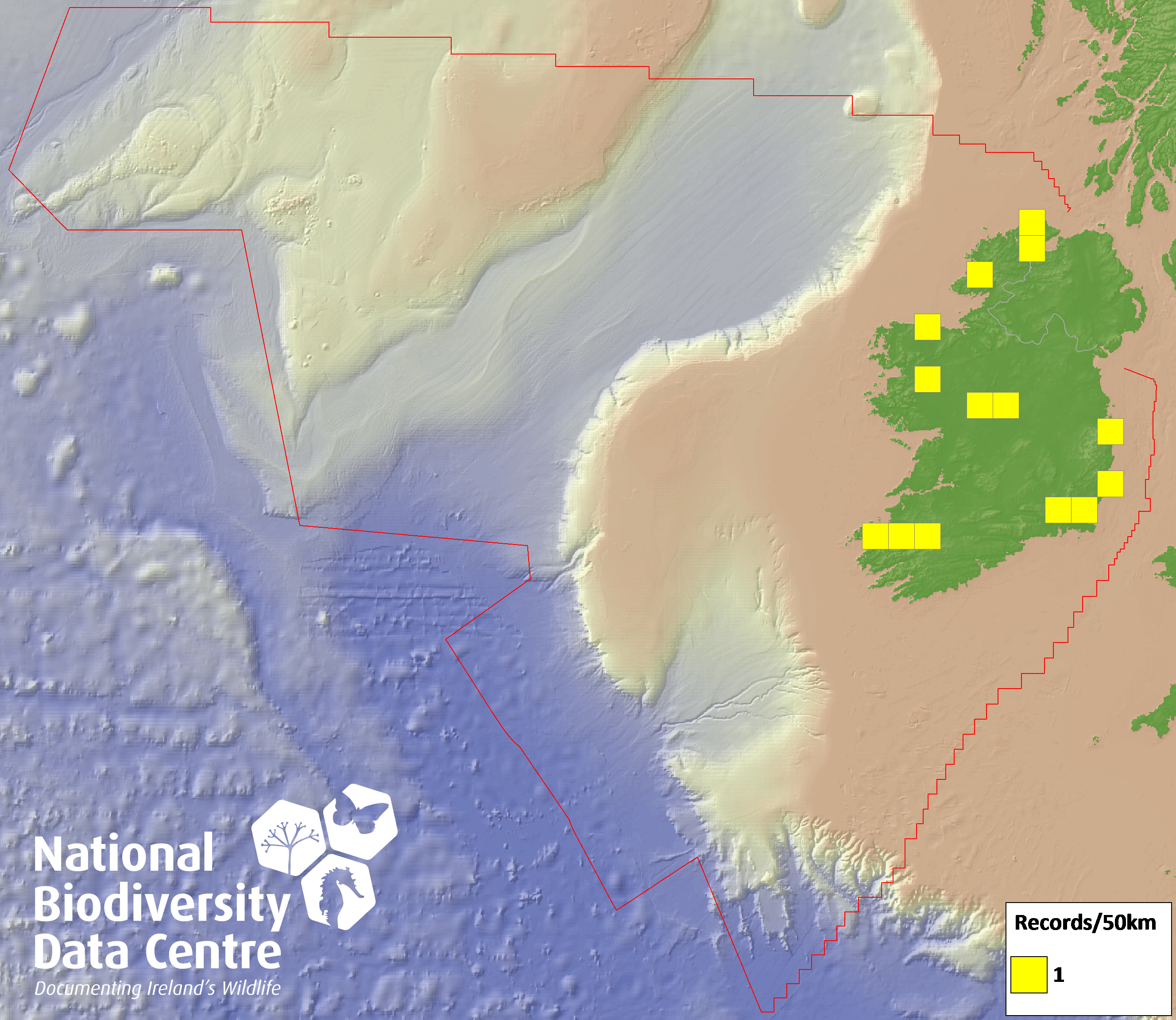 Distribution of the number of records recorded within each 10km grid square (ITM).Marine Map - 50km