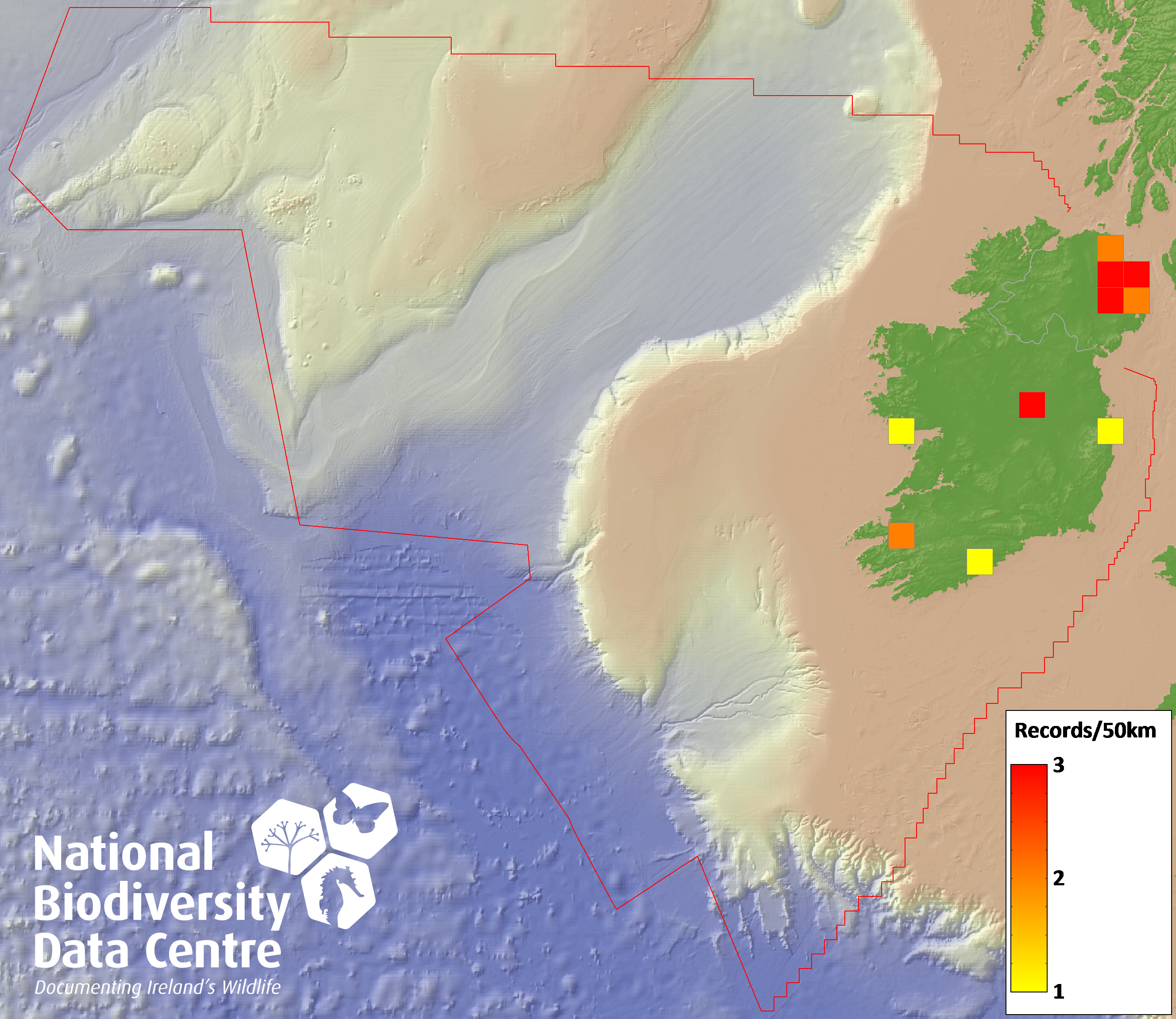 Distribution of the number of records recorded within each 10km grid square (ITM).Marine Map - 50km