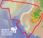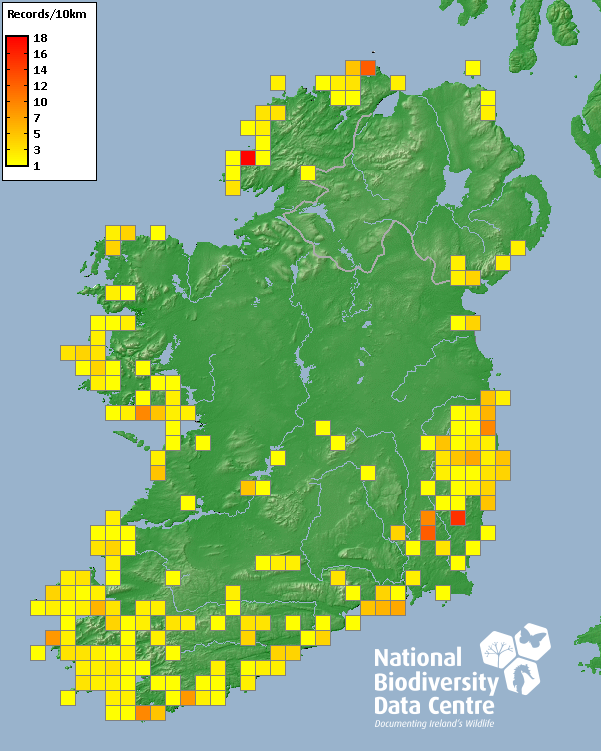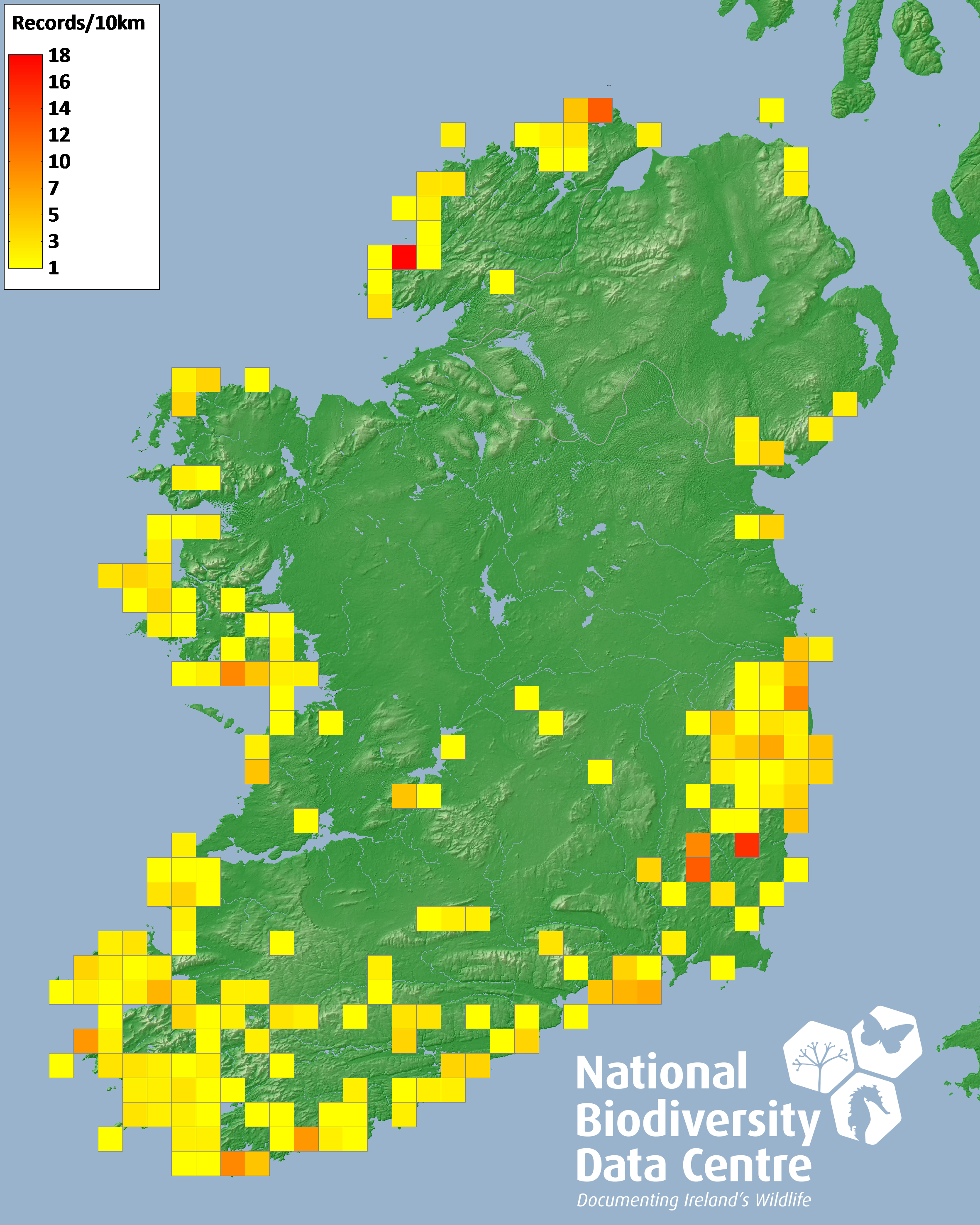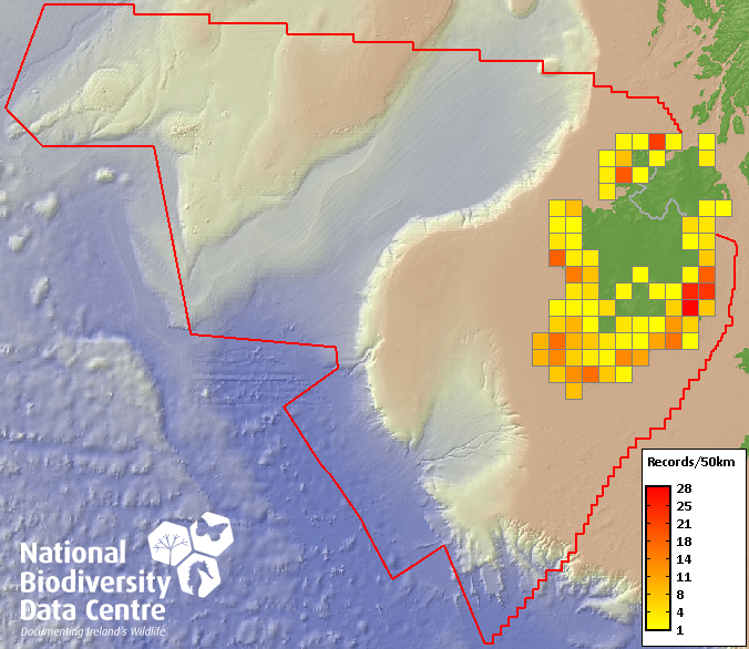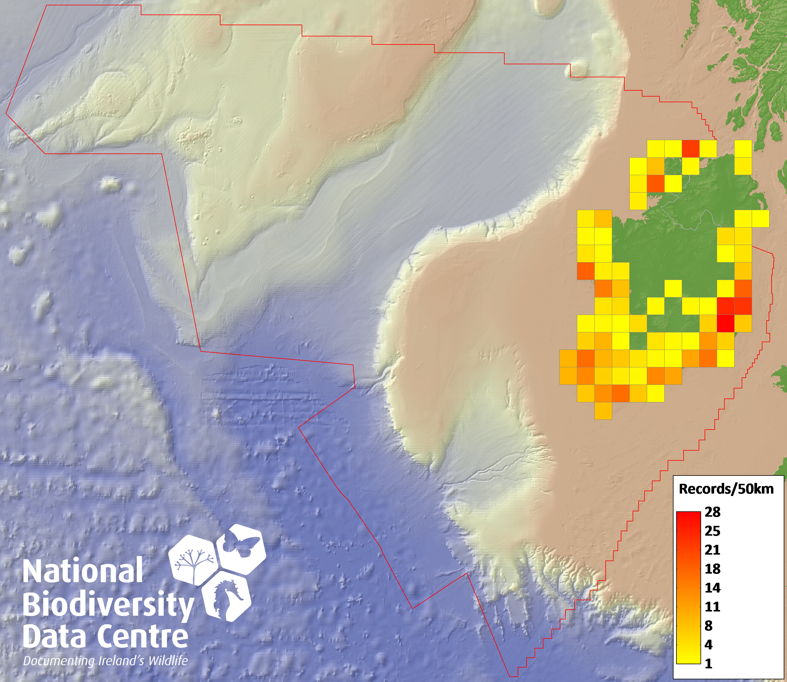 Distribution of the number of records recorded within each 10km grid square (ITM).Marine Map - 50km