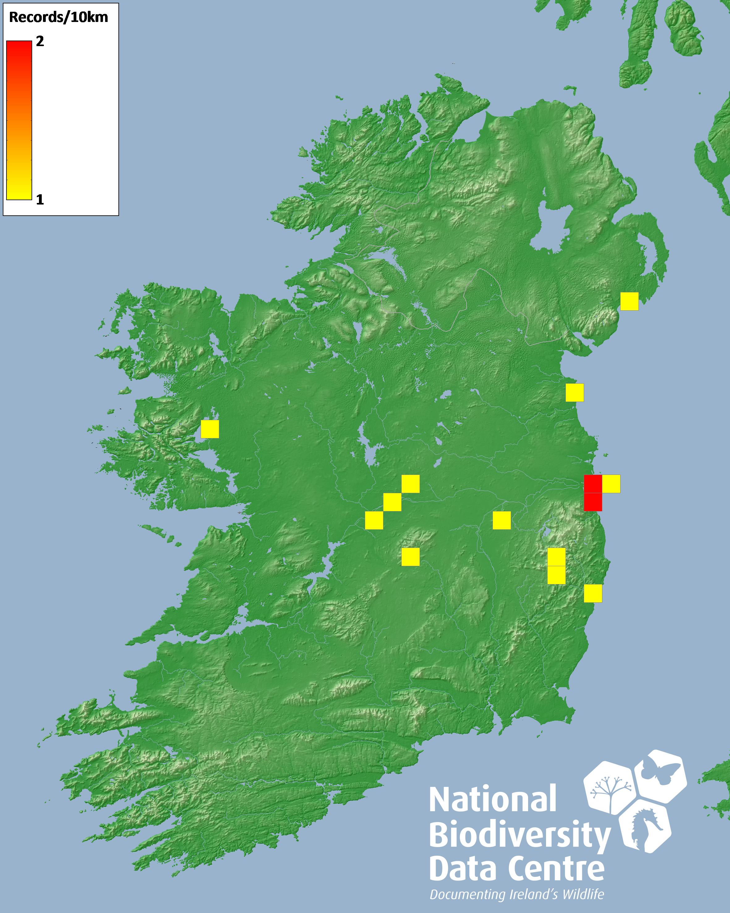 Distribution of the number of records recorded within each 10km grid square (ITM).Marine Map - 50km