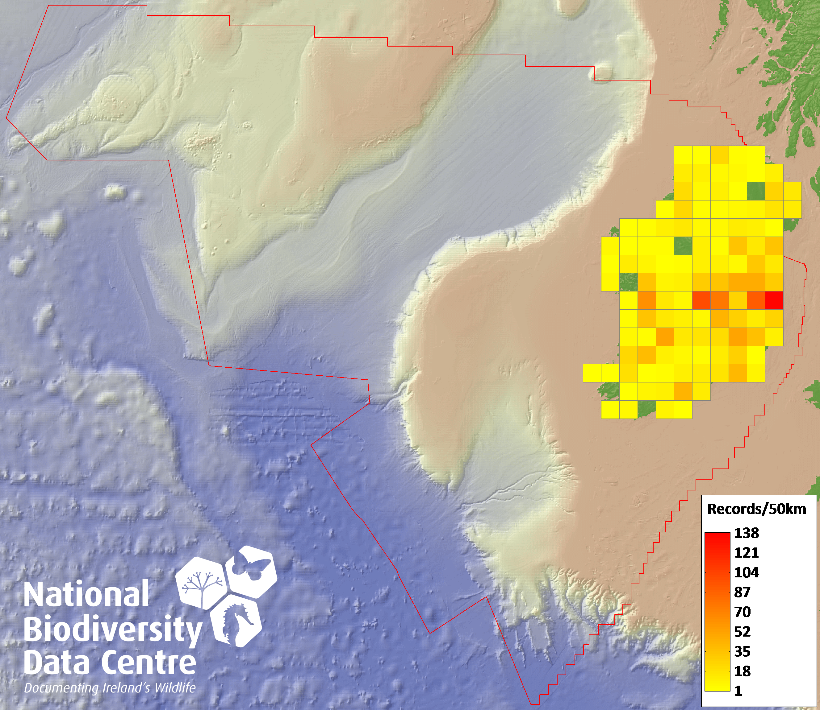 Distribution of the number of records recorded within each 10km grid square (ITM).Marine Map - 50km