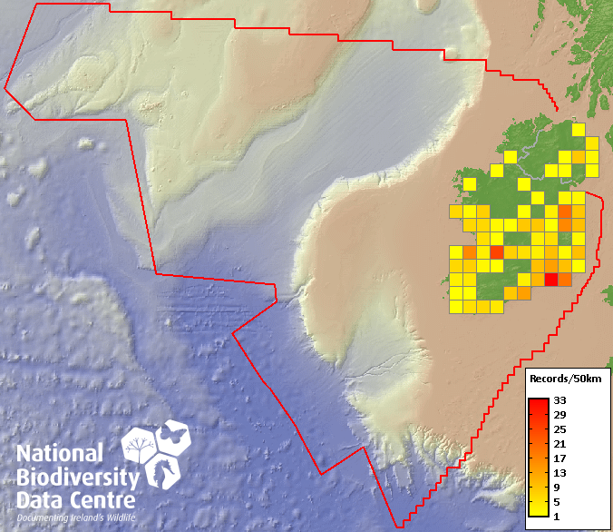 Distribution of the number of records recorded within each 10km grid square (ITM).Marine Map - 50km