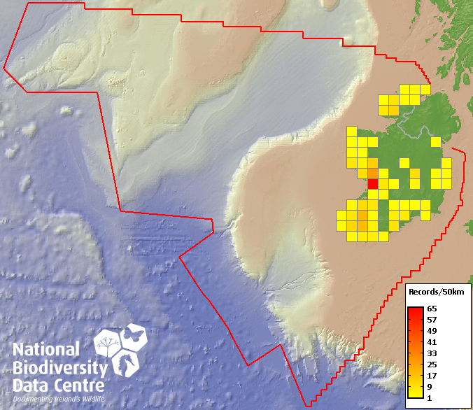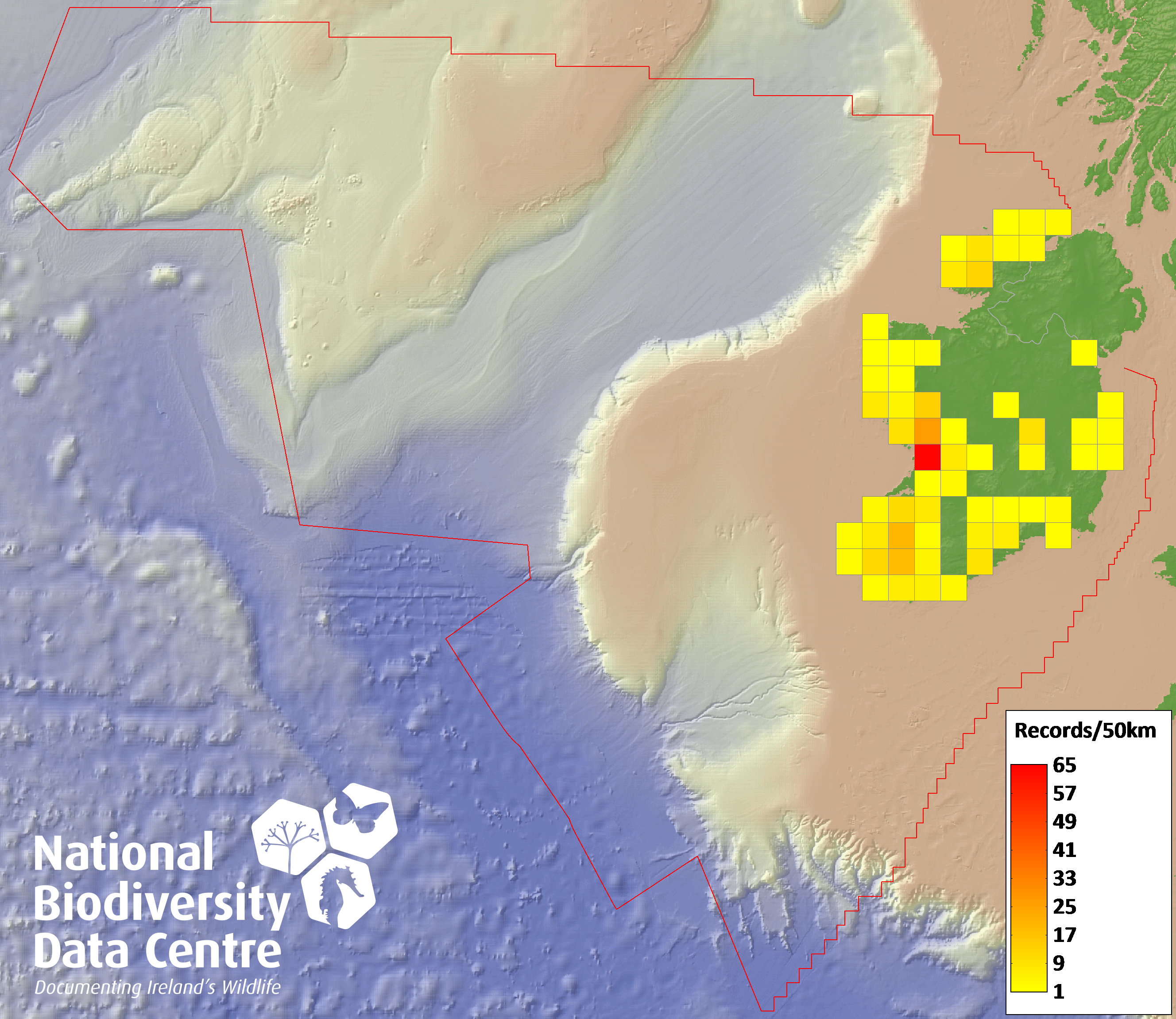 Distribution of the number of records recorded within each 10km grid square (ITM).Marine Map - 50km