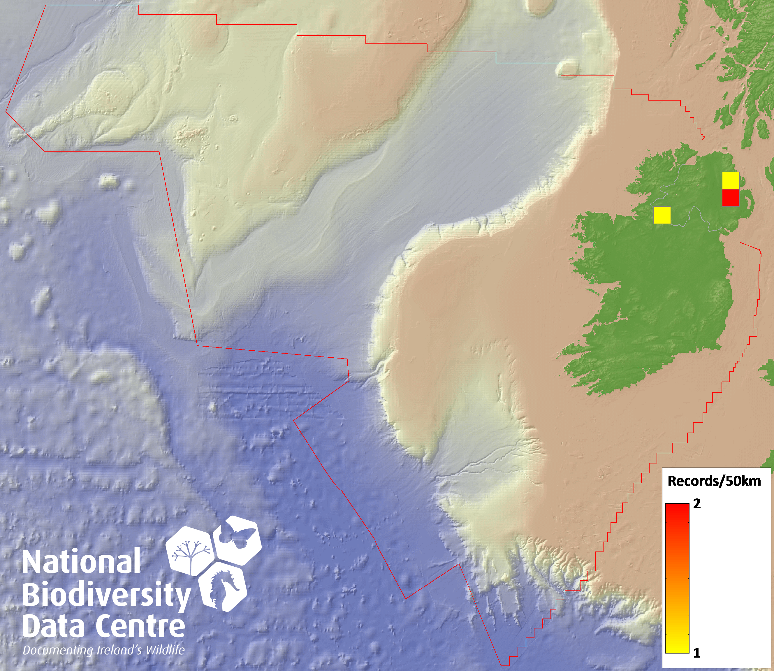 Distribution of the number of records recorded within each 10km grid square (ITM).Marine Map - 50km
