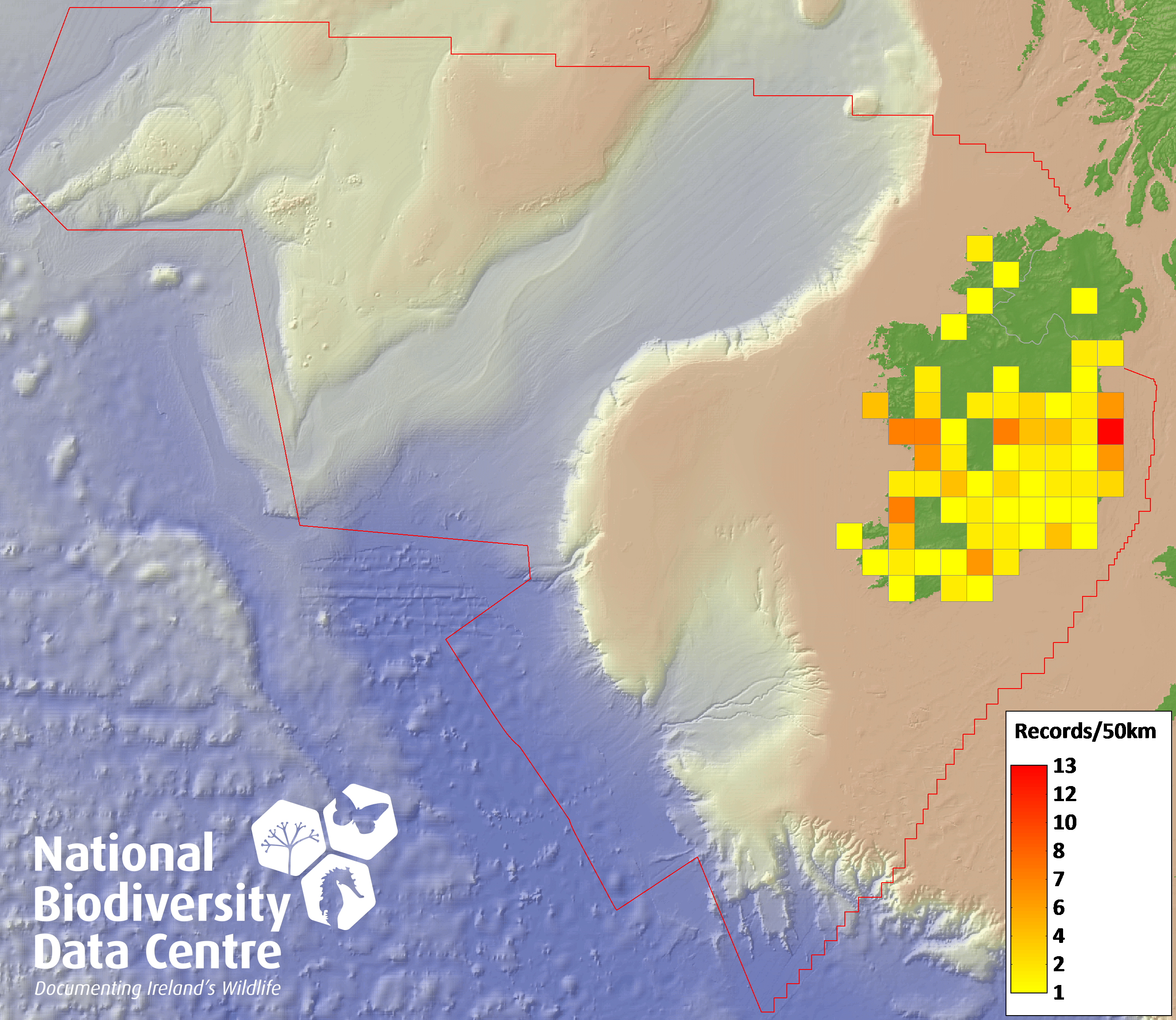 Distribution of the number of records recorded within each 10km grid square (ITM).Marine Map - 50km