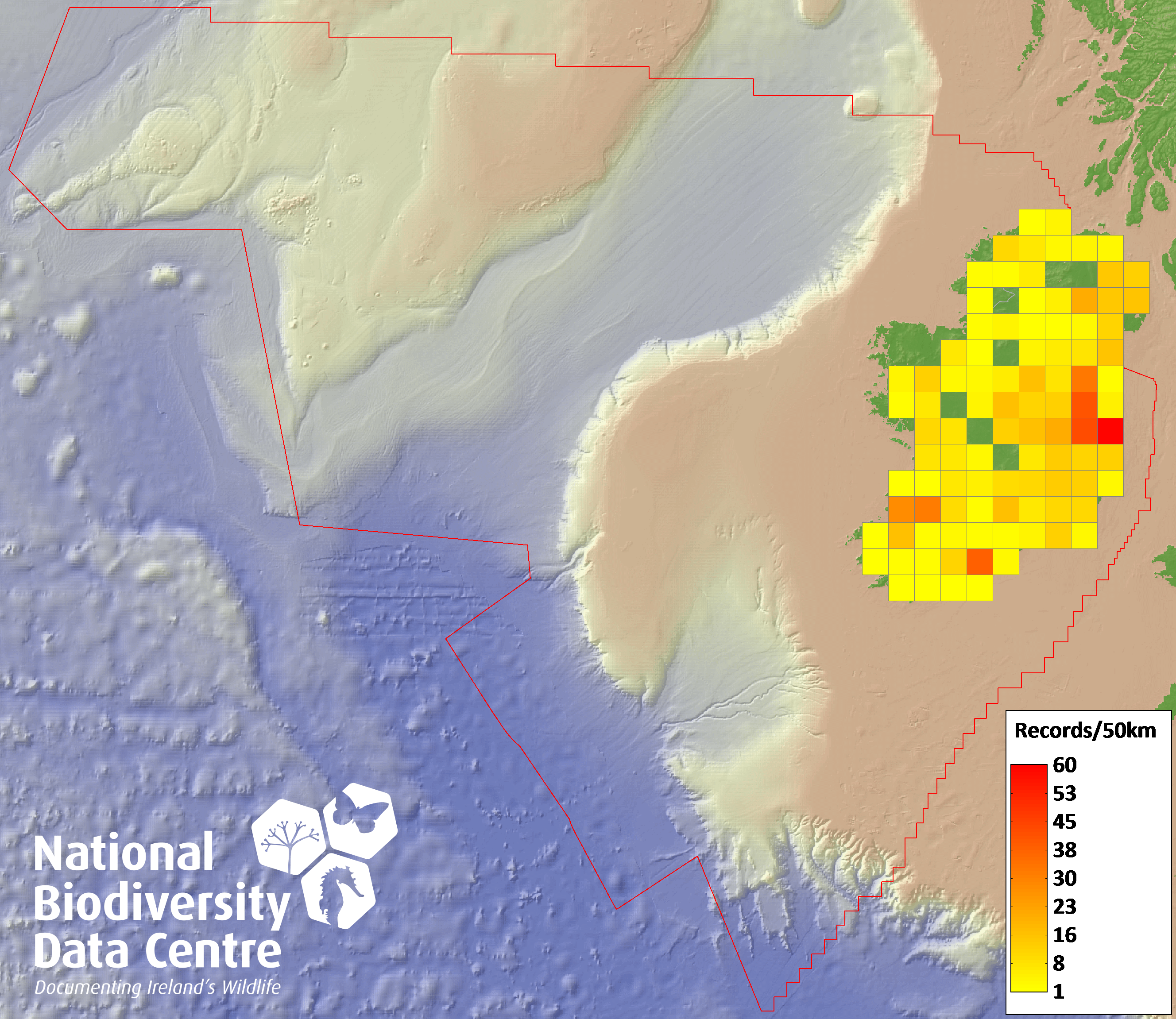 Distribution of the number of records recorded within each 10km grid square (ITM).Marine Map - 50km
